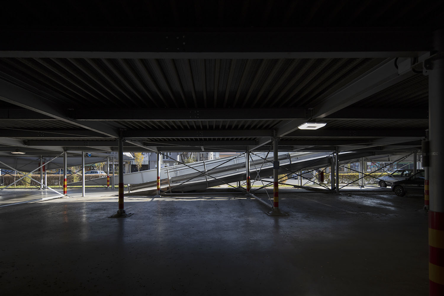 Rampe za kretanje vozila sa donje na gornju etažu su opremljene grejačima za slučajeve otežanih vremenskih uslova. Na svakom od dva ulazno-izlazna kontrolna punkta se nalazi automatska podizna rampa, terminal za izdavanje tiketa i kućica za portira.