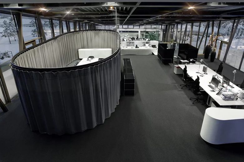 Aneks u kojem se nalaze kancelarije sa staklenim pregradama smešten je na četiri nivoa, poput prostranih kaskada po kojima su podeljene radne jedinice. Pri njihovom dizajnu se pazilo da svaki nivo bude akustično odvojen panelima unutar prostora tako da cela staklena struktura pravi elegantan prelaz između zatvorenog prostora i njegovog okruženja. Ovaj dizajn trebalo bi da motiviše na produktivnost, ali i da poboljša internu komunikaciju između zaposlenih.