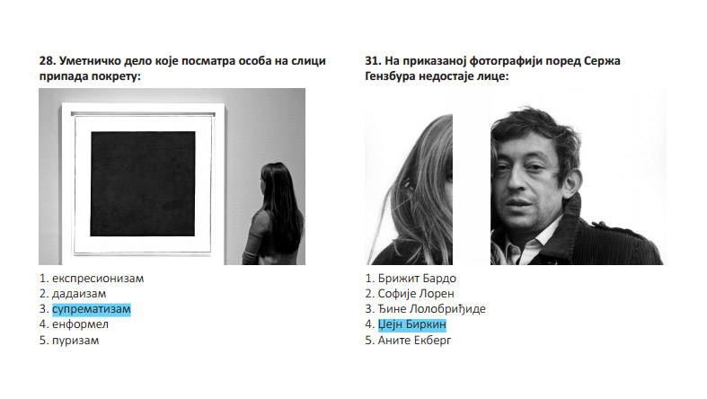 Prva grupa pitanja vezana je za različite oblasti kulture a koja su, kako se navodi u testu, relevantna za studije arhitekture. Tu su, na primer pitanja, za koga se vezuje za afera Votegejt, šta označava termin Zeitgeist, šta je Sotheby, s kojim pitanjem je povezan pojam hermeneutika, a potom pitanja postaju teža. Uz pitanje „U arhitekturi poslovnog centra Ušće mogu se prepoznati karakteristike kakve je razvijao:“ data je i slika zgrade Ušća a buduće arhitekte bi trebale da znaju da je u pitanju Mis van der Roe. Dalje, tu je detalj s fasade jedne zgrade, a maturanti treba da znaju da se radi o Jevrejskom muzeju u Berlinu.