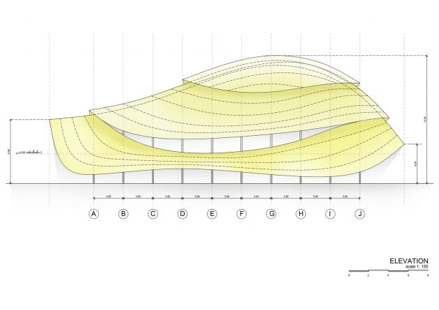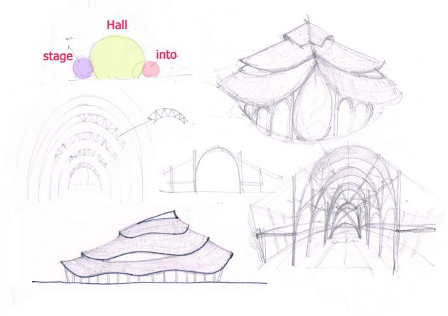 Glavni nosači hale su rešetke od bambusa s rasponima preko 17 metara i to bez metalnih ojačanja ili metalnih veza.
