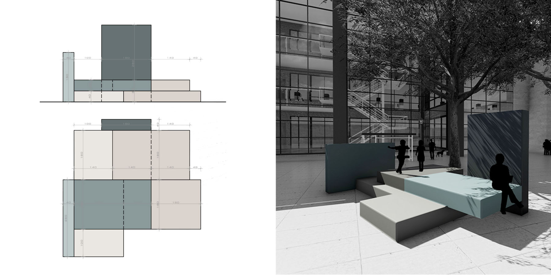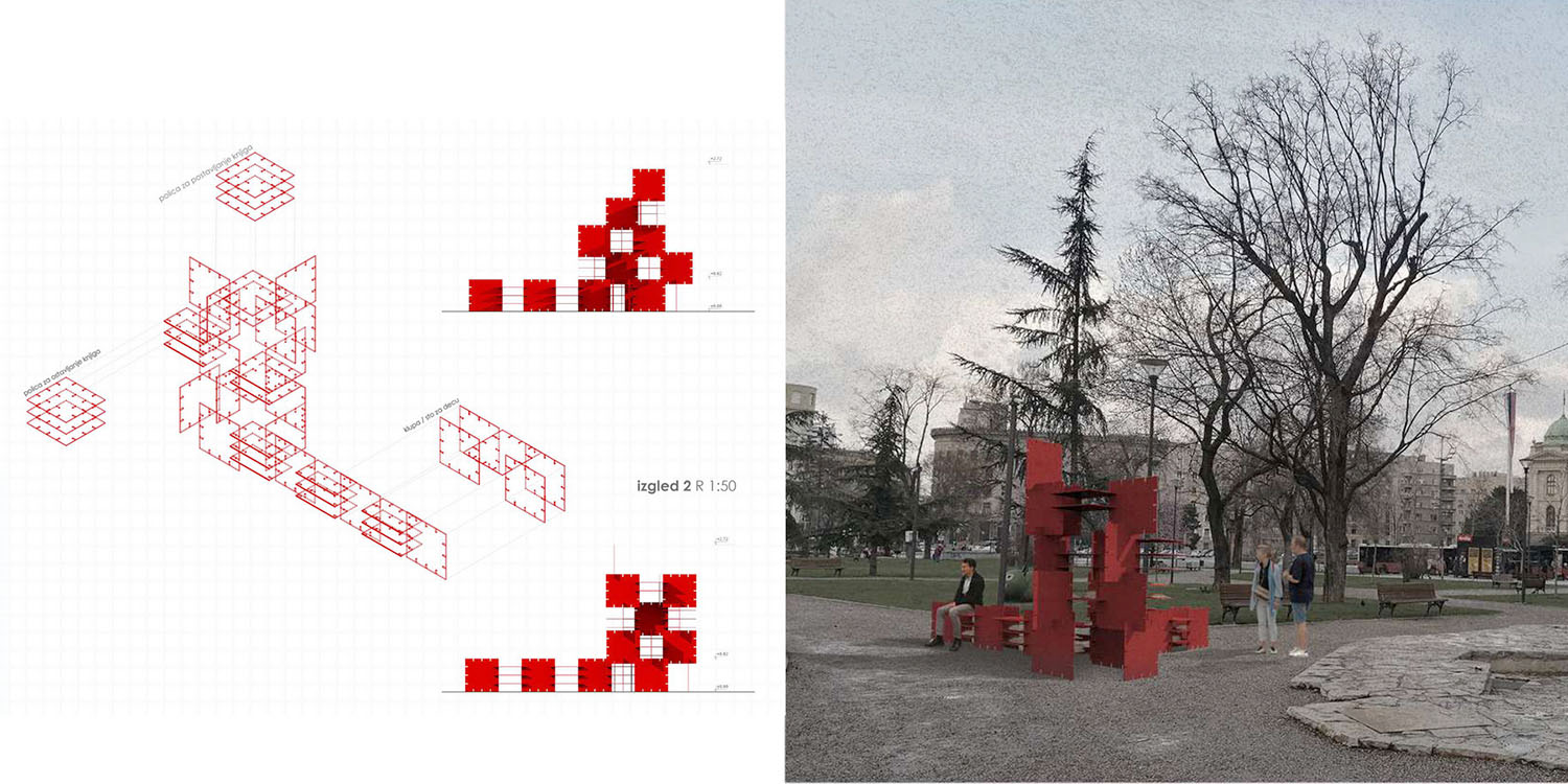 U osnovi koncepta se nalazi monumentalan jedinični element prostorne instalacije, koji zahvaljujući svojoj jednostavnoj geometriji i proporcijama omogućuje kreiranje različitih prostorno-programskih scenarija u zavisnosti od dispozicije jediničnih modula. Monumentalnost koja je postignuta dimenzijama monolitnih ploča u funkciji je definisanja mesta koje promoviše čitalačku kulturu i daje markantno obeležje u gradskom prostoru.