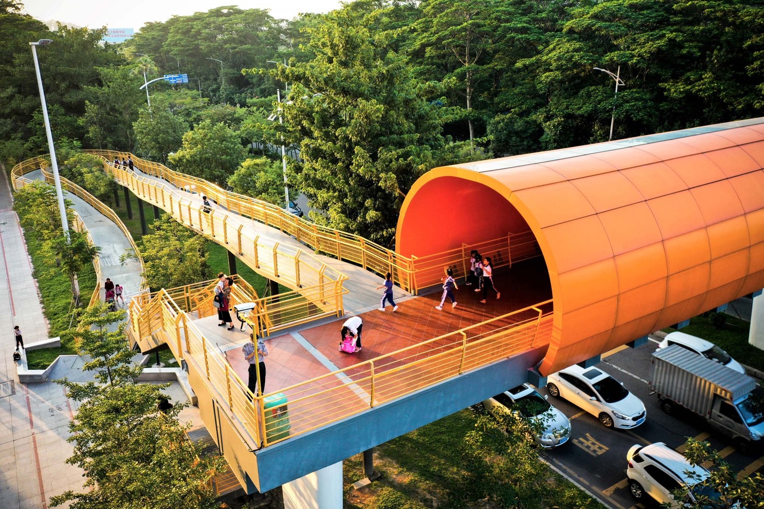 Južni kraj pasarele završava se serpentininom koja vijuga oko krošnji drveća. “Deca mogu da trče gore-dole kao da lete kroz šumu.” – ističu arhitekte za ArchDaily.