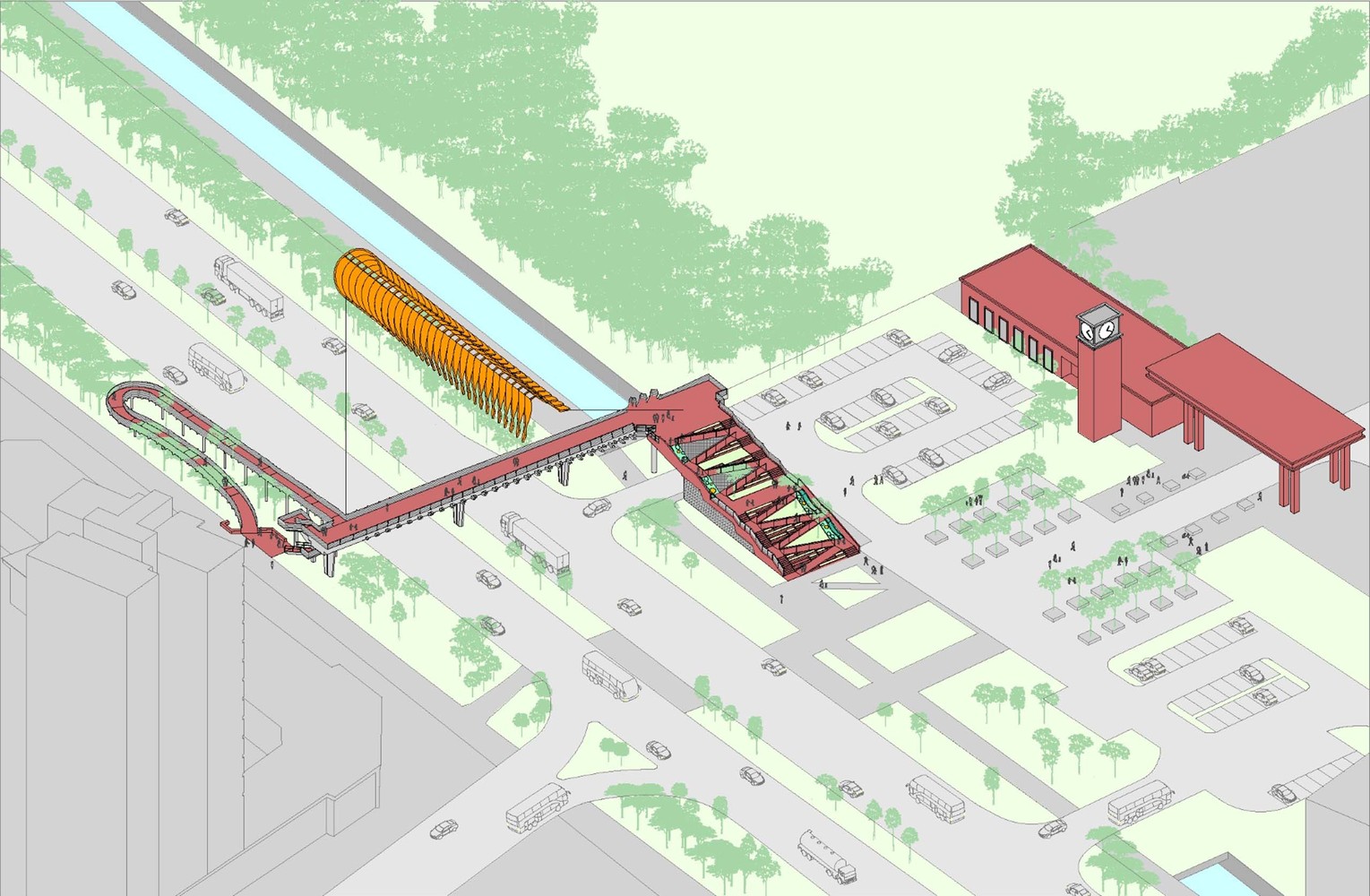 Drugim rečima, arhitekte su „oljuštile“ postojeći ulični zeleni pojas i povezali ga sa mostom, stvarajući svojevrsni park. Pored stepenica, postavljena je cik-cak rampa kao i igrališta za decu da trče i igraju se.