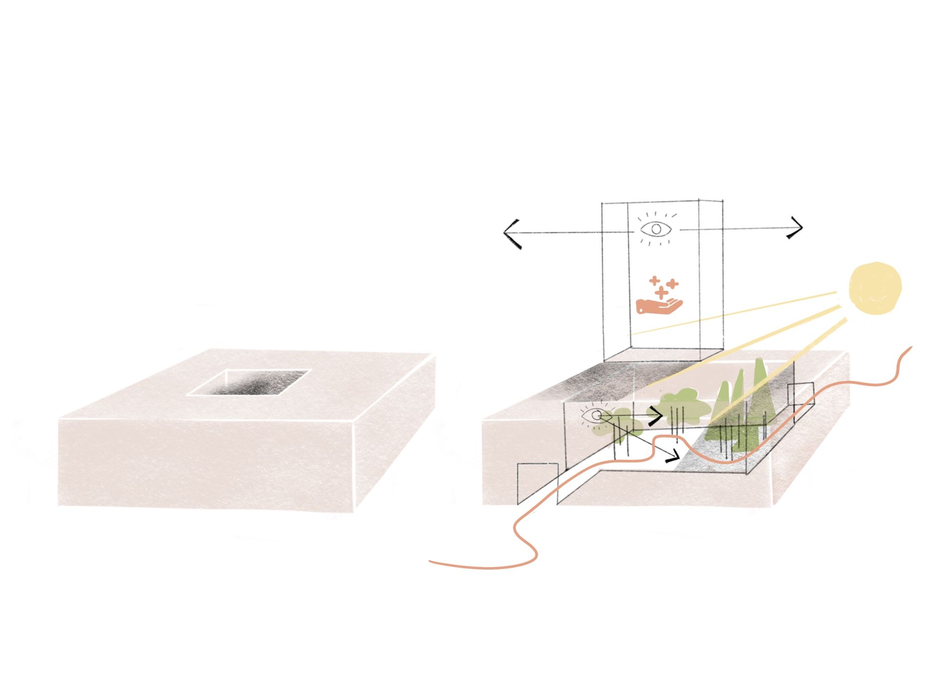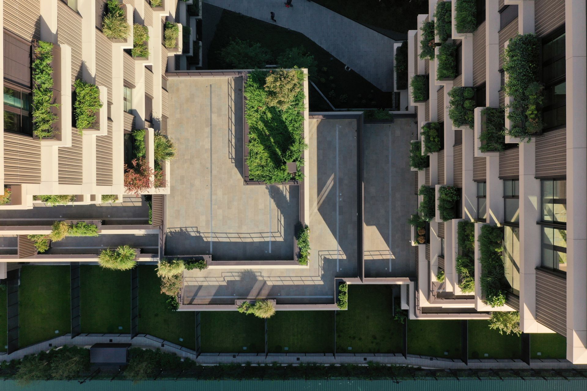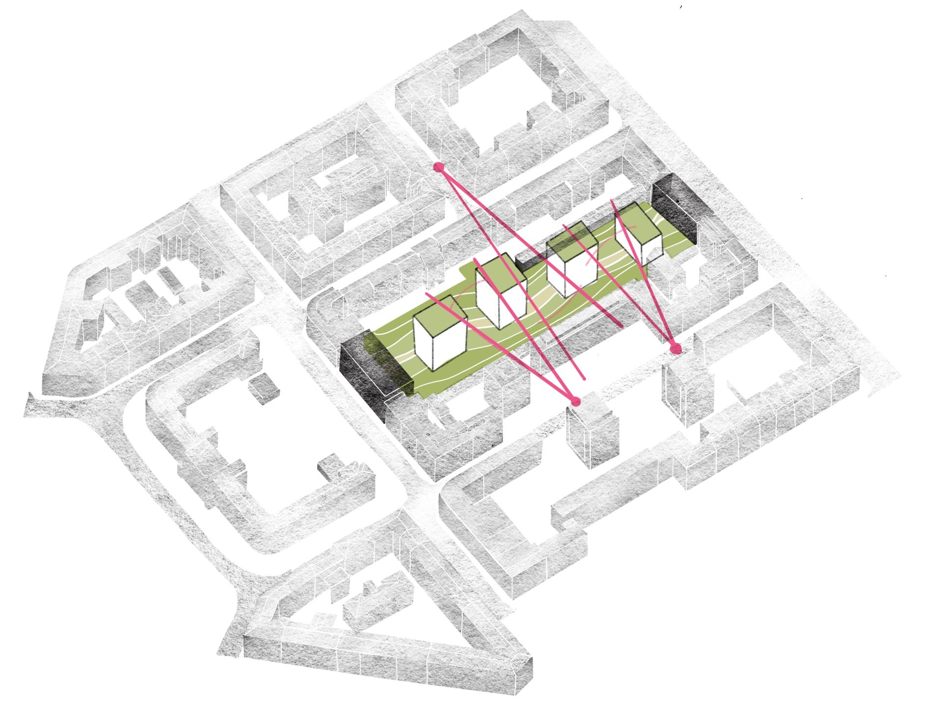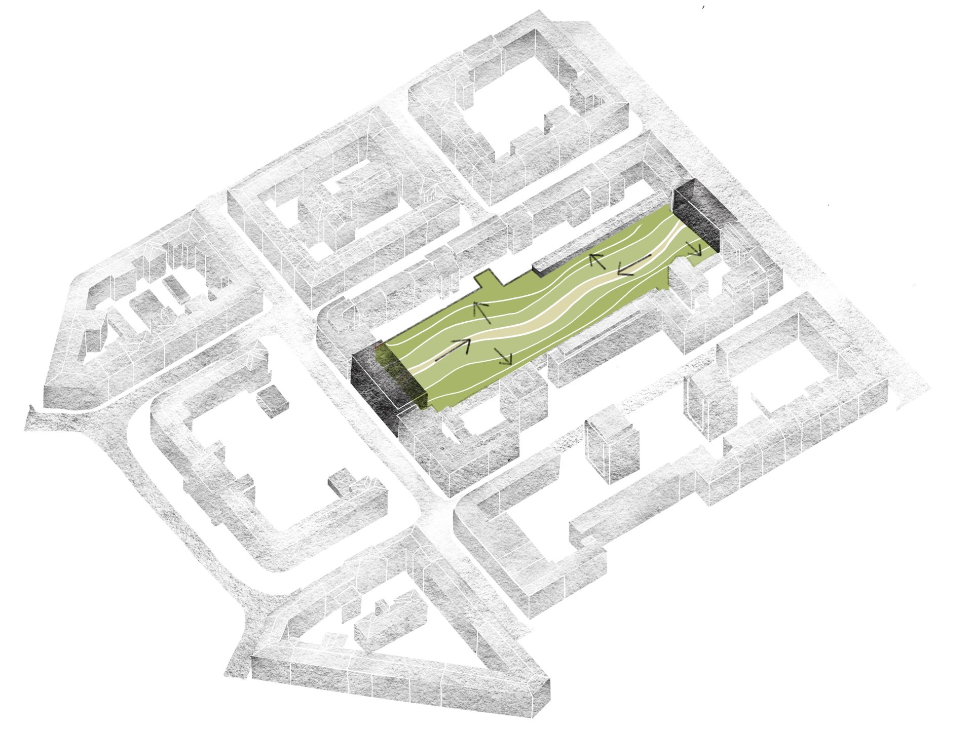 Javni prolaz kroz blok je novi zeleni krajolik koji maksimizuje zelene površine s prelazima između javnih, polujavnih i privatnih zona postupnim pomacima s travnjaka, na nisko zelenilo te na visoku šumsku sadnju.