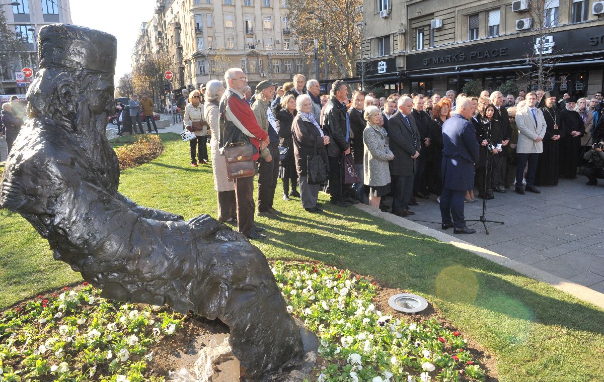 Za mesto spomenika je odabran plato ispred crkve Svetog Marka, u blizini tramvajske okretnice, što možda dodatno aludira na njegovu skromnost u odabiru prevoznog sredstva u Beogradu – javni gradski saobraćaj. U ovom slučaju je odabrana sedeća figura, takođe pognute glave i zamišljenog pogleda. Umetnička obrada ima nešto više ekspresionistički izraz, ali to ne umanjuje njenu vrednost i sveukupni doživljaj. Skulptura odiše jednim duhovnim mirom, dok je posmatra frontalno. Ali ako je sagledate iz nekog drugog ugla, ovaj doživljaj se gubi do granica neprijatnosti.