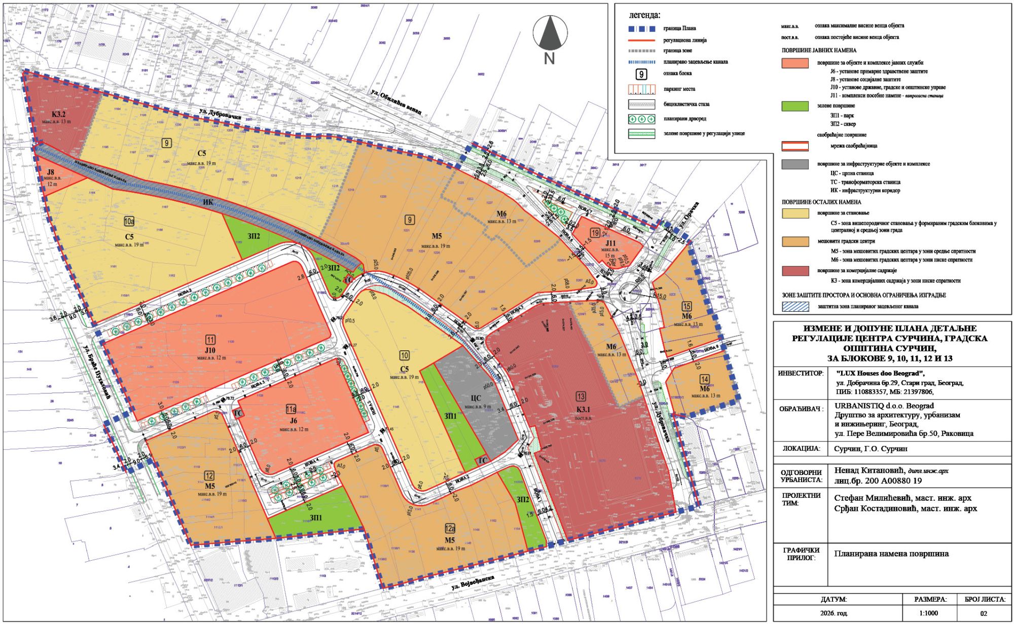 Investitor izrade plana za centar Surčina je preduzeće LUX Houses d.o.o. iz Beograda, nosilac izrade je Urbanistiq d.o.o. iz Beograda, dok je kao rukovodilac tima i odgovorni urbanista potpisan Nenad Kitanović, dia.