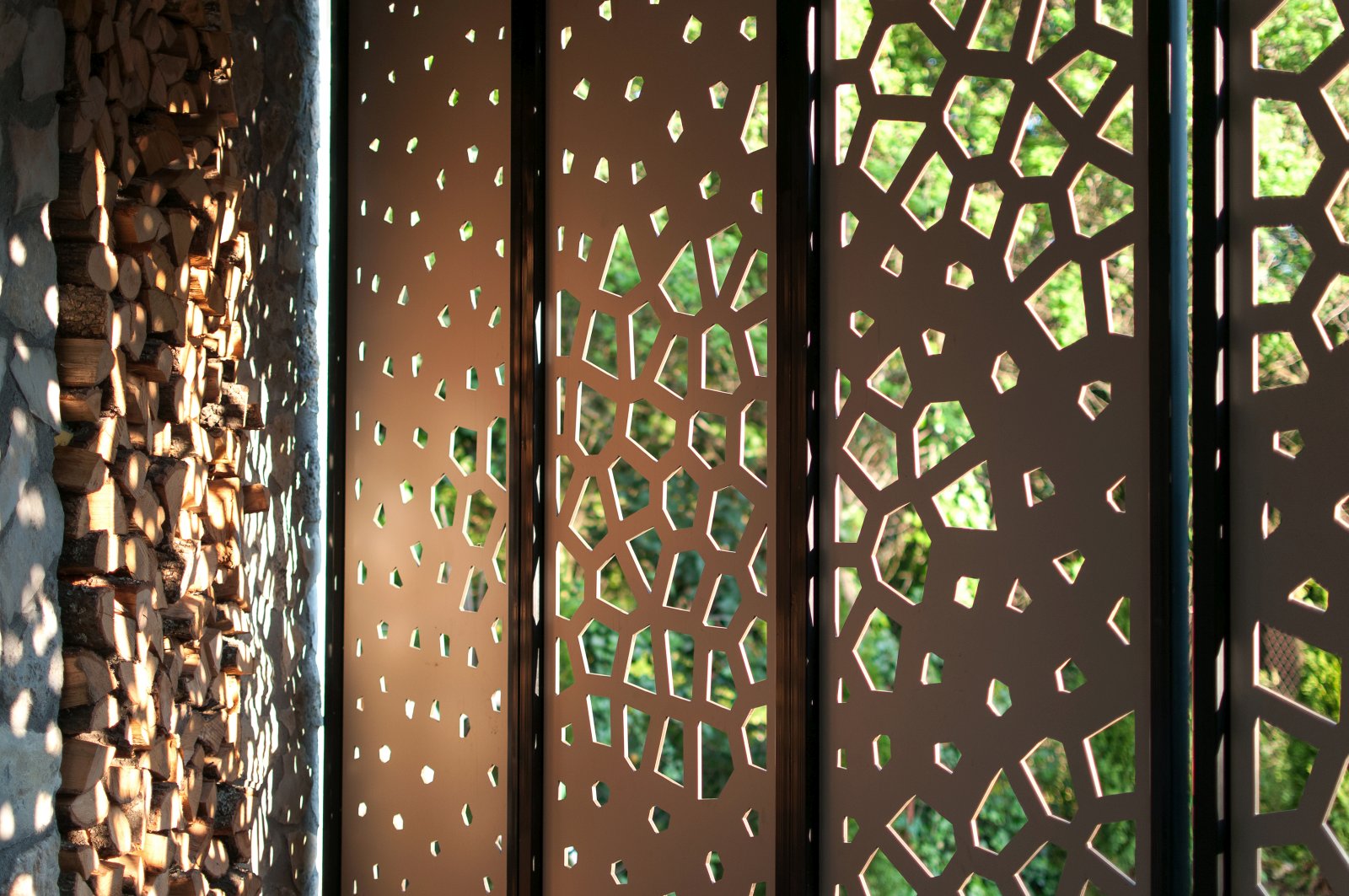 Naime, sa spoljašnje strane terasa se zatvara pokretnim perforiranim panelima koji imaju funkciju zaštite od sunca. Ovi paneli su perforirani primenom digitalnog dizajna i fabrikacije, a inspirisani su geometrijskim motivima ćilima. Na ovaj način je omogućena igra svetlosti i senke, stvaranjem različitih svetlosnih efekata na unutrašnjim površinama.