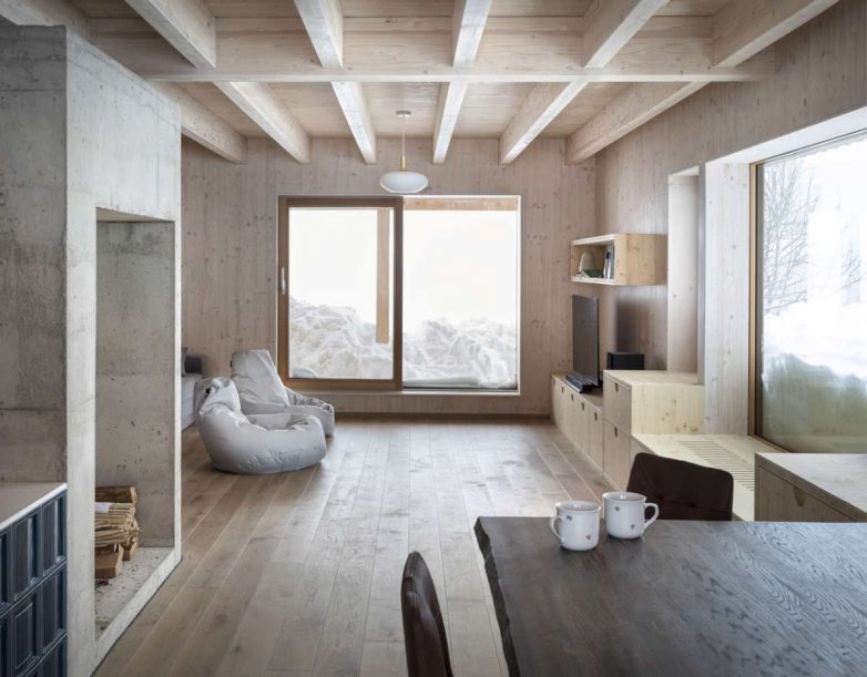 Bazu objekta čini betonski podrum koji nosi teret cele planinske kuće napravljene od drvenih CLT panela.
