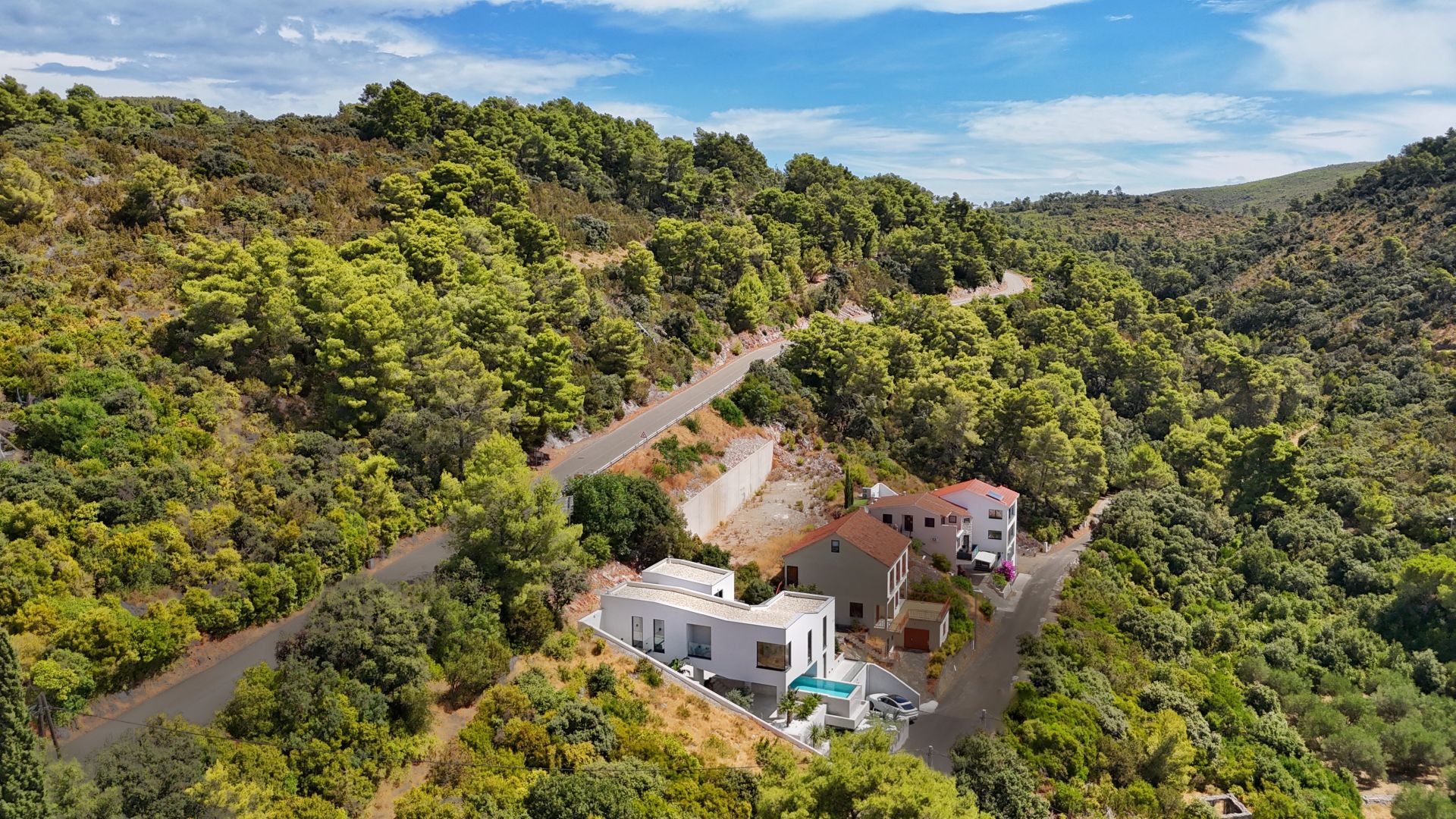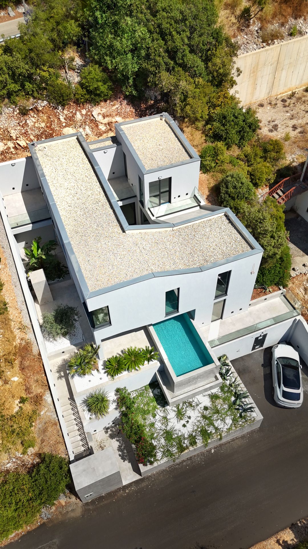S ukupno 250 m² zatvorenog prostora i 120 m² terasa, vila je koncipirana kao beli betonski volumen s izraženim horizontalama, velikim konzolnim natkrivenjima i kontrolisanim otvorima koji omogućuju optimalno osvetljenje i ventilaciju.