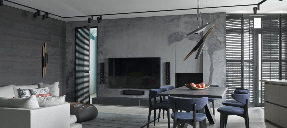 Sivo plavi tonovi ukombinovani sa efektnom rasvetom, savremenim komadima nameštaja i tamnijim teksturama, daju ovom stanu šik izgled.