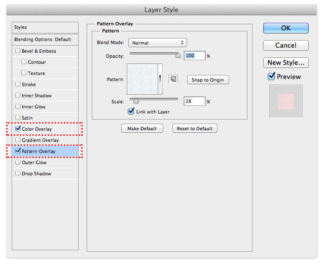 - Room Filling LayerLayer Effect > Color overlay: Red, RGB 255/0/0, 30% Opacity Layer Effect > Pattern overlay: Concrete Pattern
