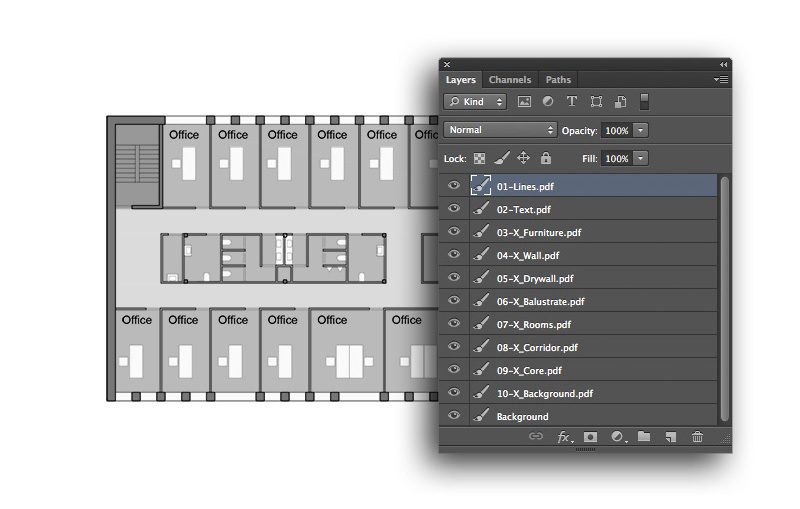 Kako biste stvorili suptilan i apstraktan prikaz osnove možete koristiti concrete pattern i postaviti ga na vaš lejer. Ako želite da vršite izbor u širokom rasponu tekstura pretragu obavite na na cgtextures.com i tamo ćete dobiti sve što vam je potrebno. Za crveni izgled prikaza možete koristiti color overlay i u opciji blend mode izaverite „multiply“ za intezitet postavite za kancelarije 30%, hodnike 10% ukoliko želite isti prikaz kao na uzorku. Ukoliko želite ovakav izgled, vaše boje i lejere postavite na ovaj način: