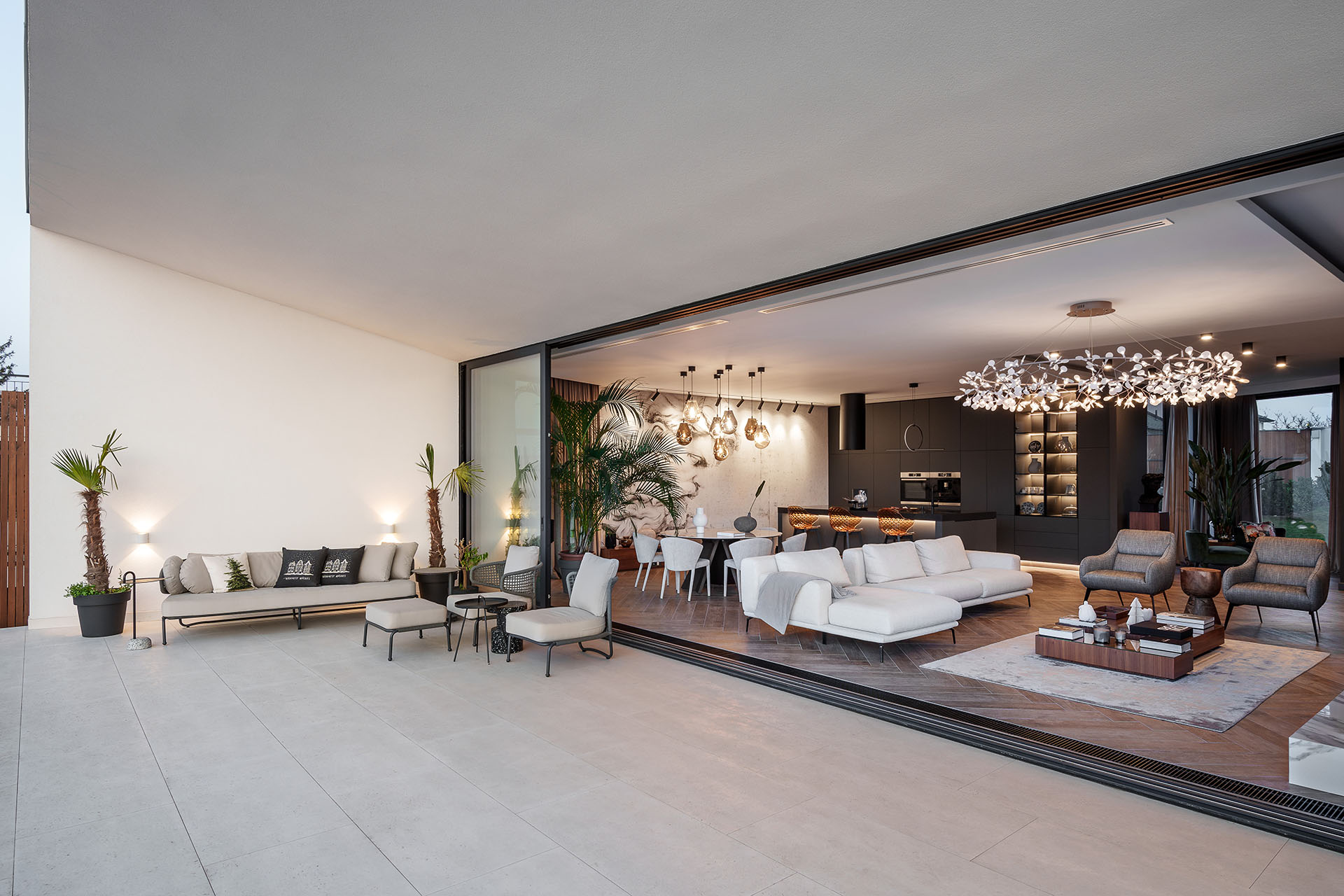 Veliki stakleni portal zahvata prostorije dnevnog boravka, kuhinje trpezarije, spavaće sobe i kupatila.