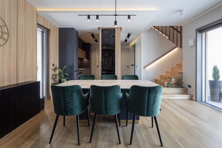 Enterijer je projektovan sa idejom da se dizajnom i estetikom podrži celokupna ideja o stvaranju duha jednoporodične kuće.