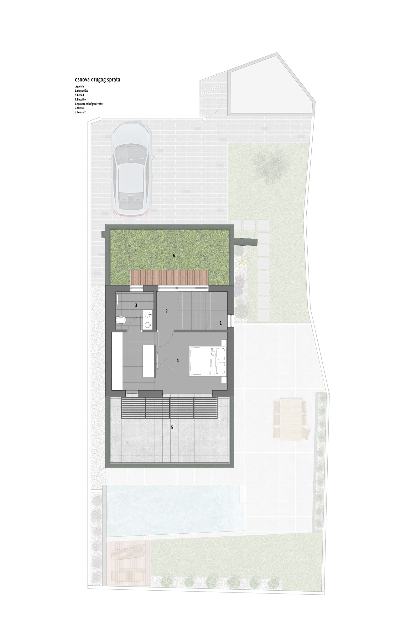 Na prvom spratu se nalaze dečije sobe sa kupatilom, a na drugom spratu spavaća soba za roditelje po principu master bedrooma sa garderobom i kupatilom. Na drugoj etaži su i dve krovne terase, jedna je direktno vezana sa spavaćom sobom, a drugoj se pristupa iz hodnika.