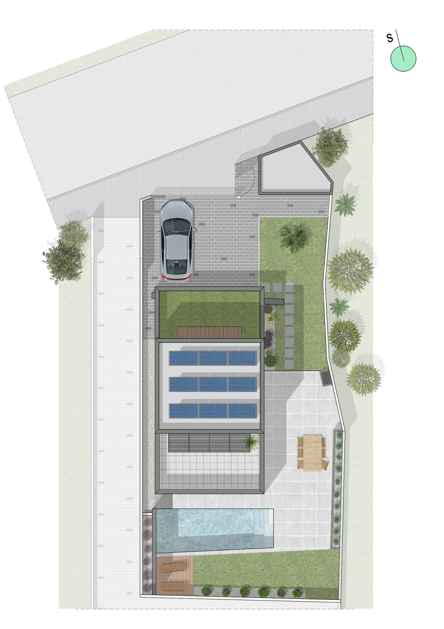 Zelenilo se sastoji od niskog i visokog rastinja, planski biranog, a bazen, iako manjih dimenzija, dovoljan je za četvoročlanu porodicu. Sa jedne strane zid bazena se izdiže iznad nivoa tla i formira zid žardinjere u kojoj je zelenilo formira vizuelnu barijeru prema komšijama.