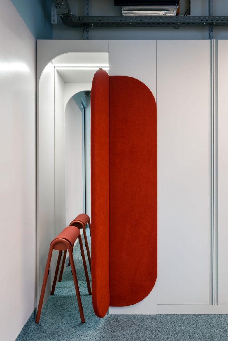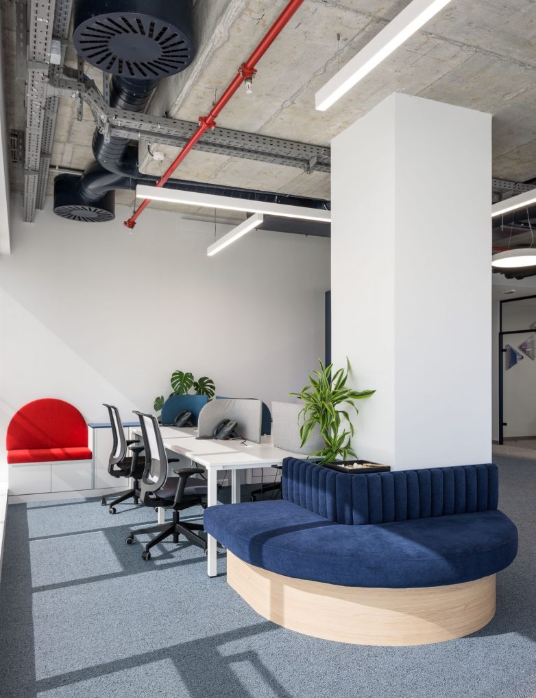 Dominantan detalj su tamna teget i crvena boja brenda aplicirana na svim linijskim elementima prostora poput instalacija otvorenog plafona, profila staklenih pregrada i komada nameštaja.