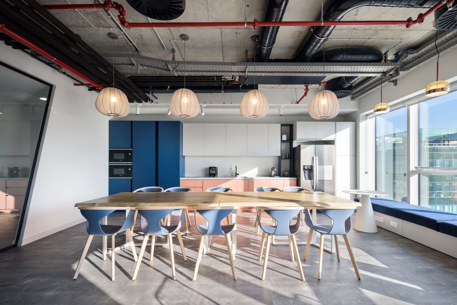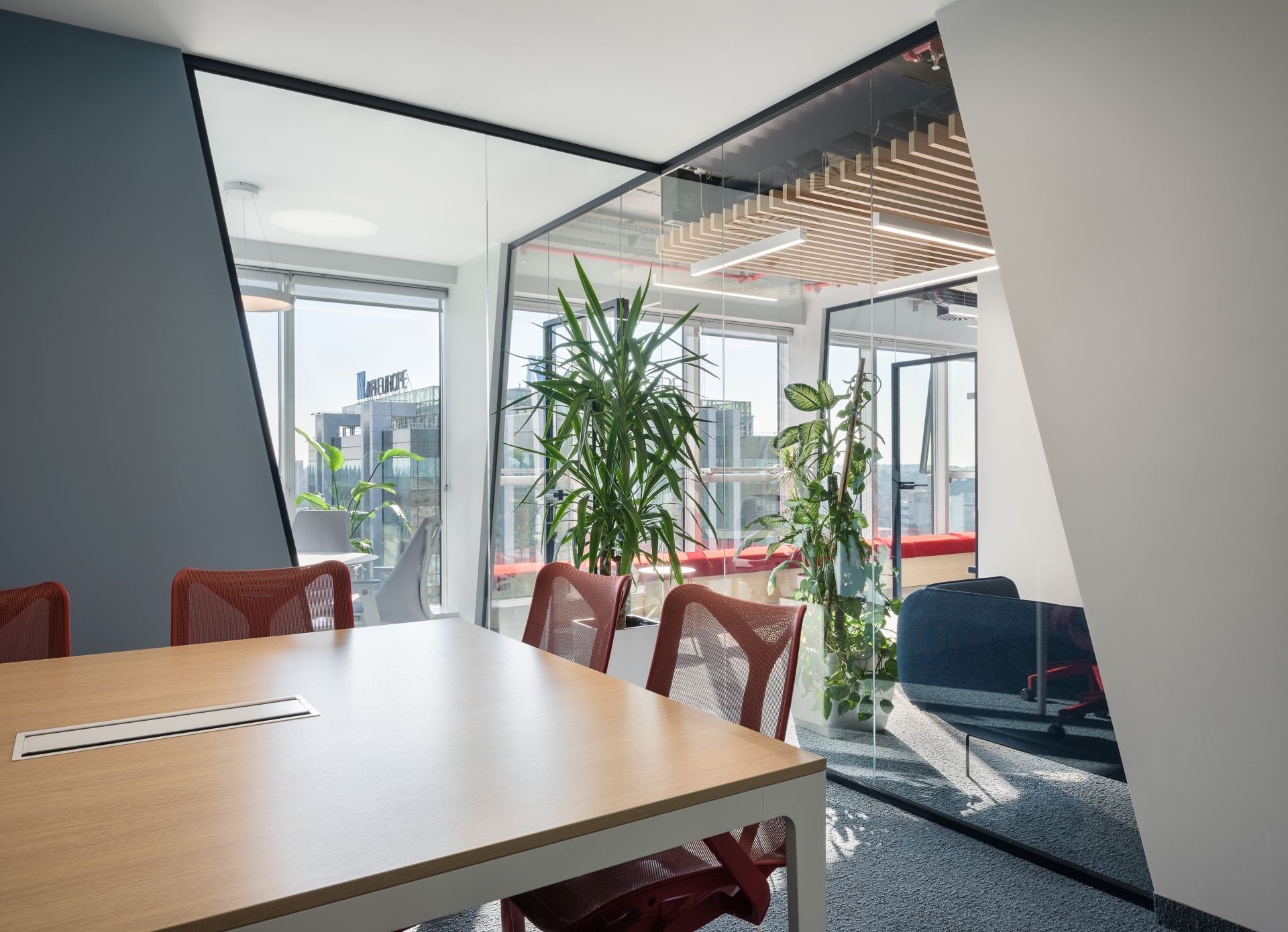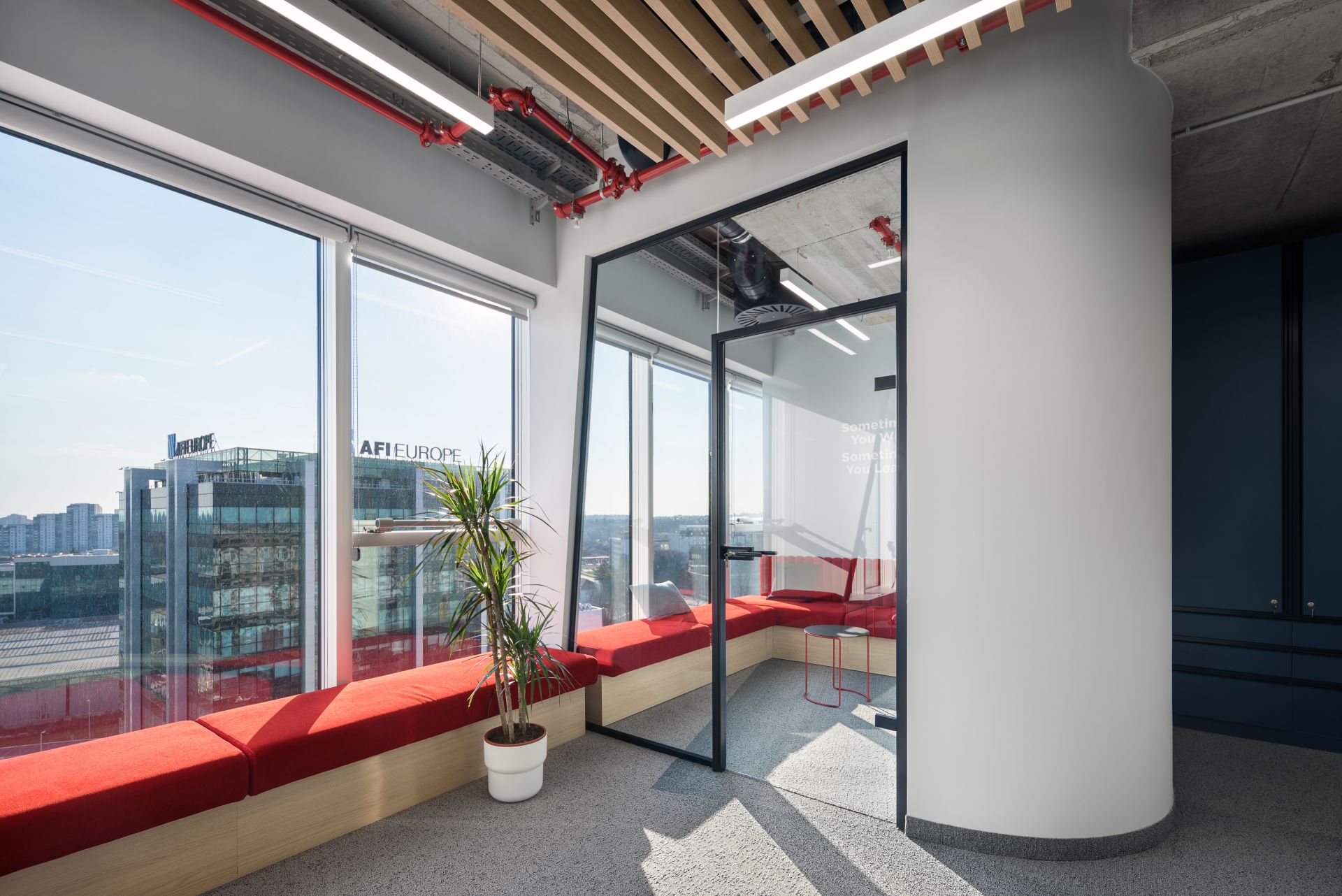 Dominantan detalj su tamna teget i crvena boja brenda aplicirana na svim linijskim elementima prostora poput instalacija otvorenog plafona, profila staklenih pregrada i komada nameštaja.