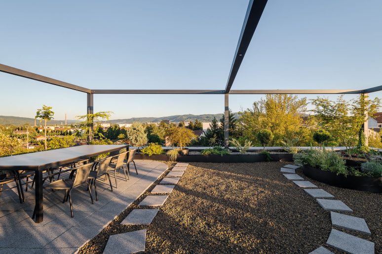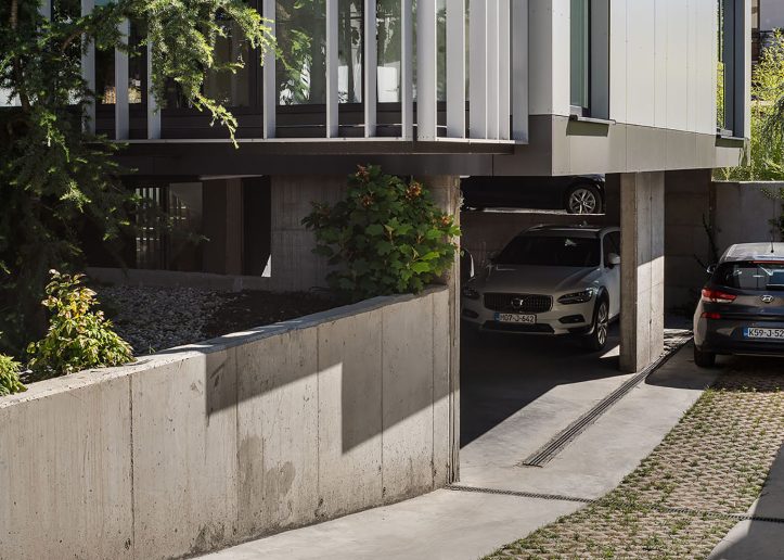 Izdizanjem objekta u odnosu na teren arhitekte su uspele da parking smeste u suteren, iskoriste potencijale parcele i maksimalno zaštite postojeće zelenilo.