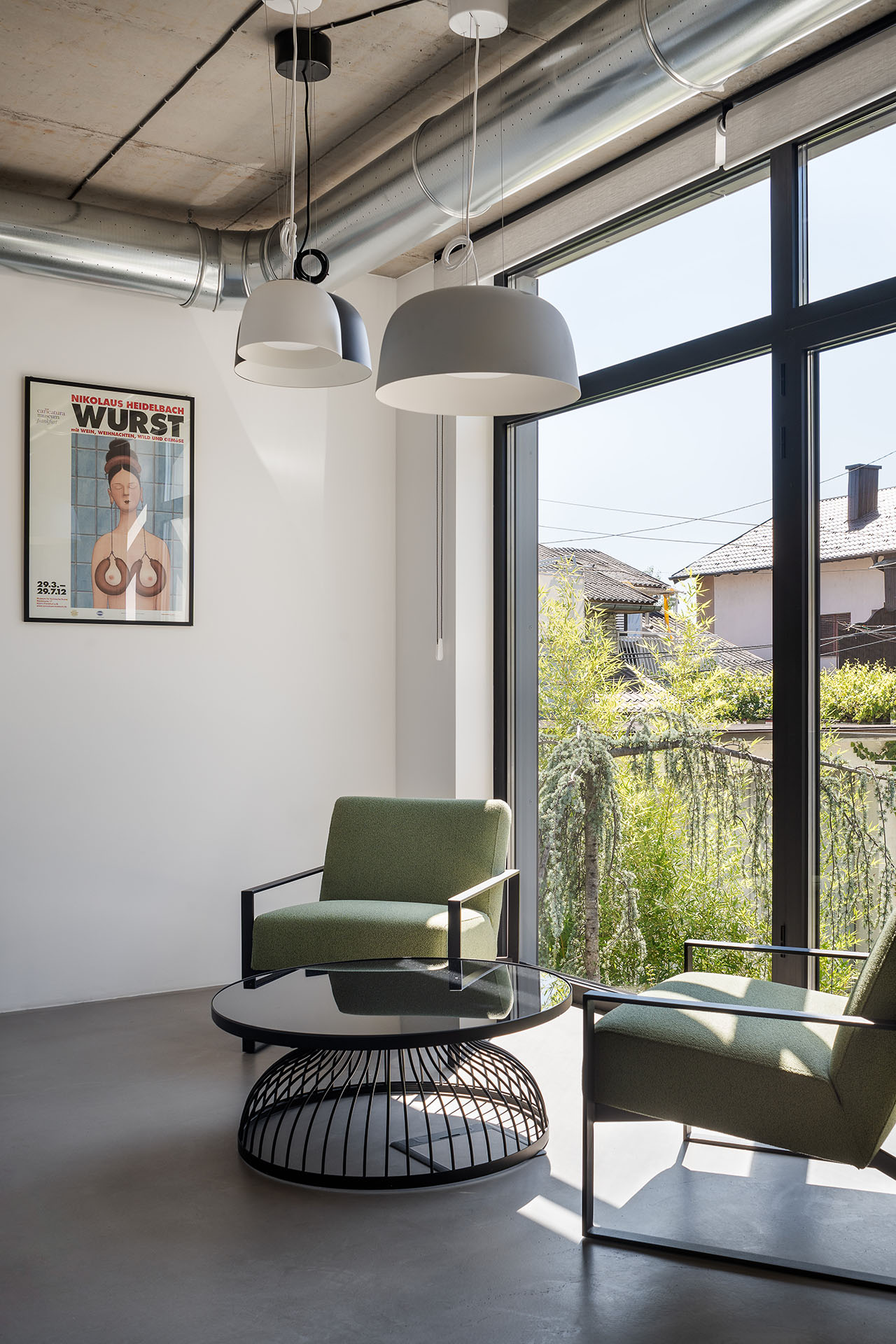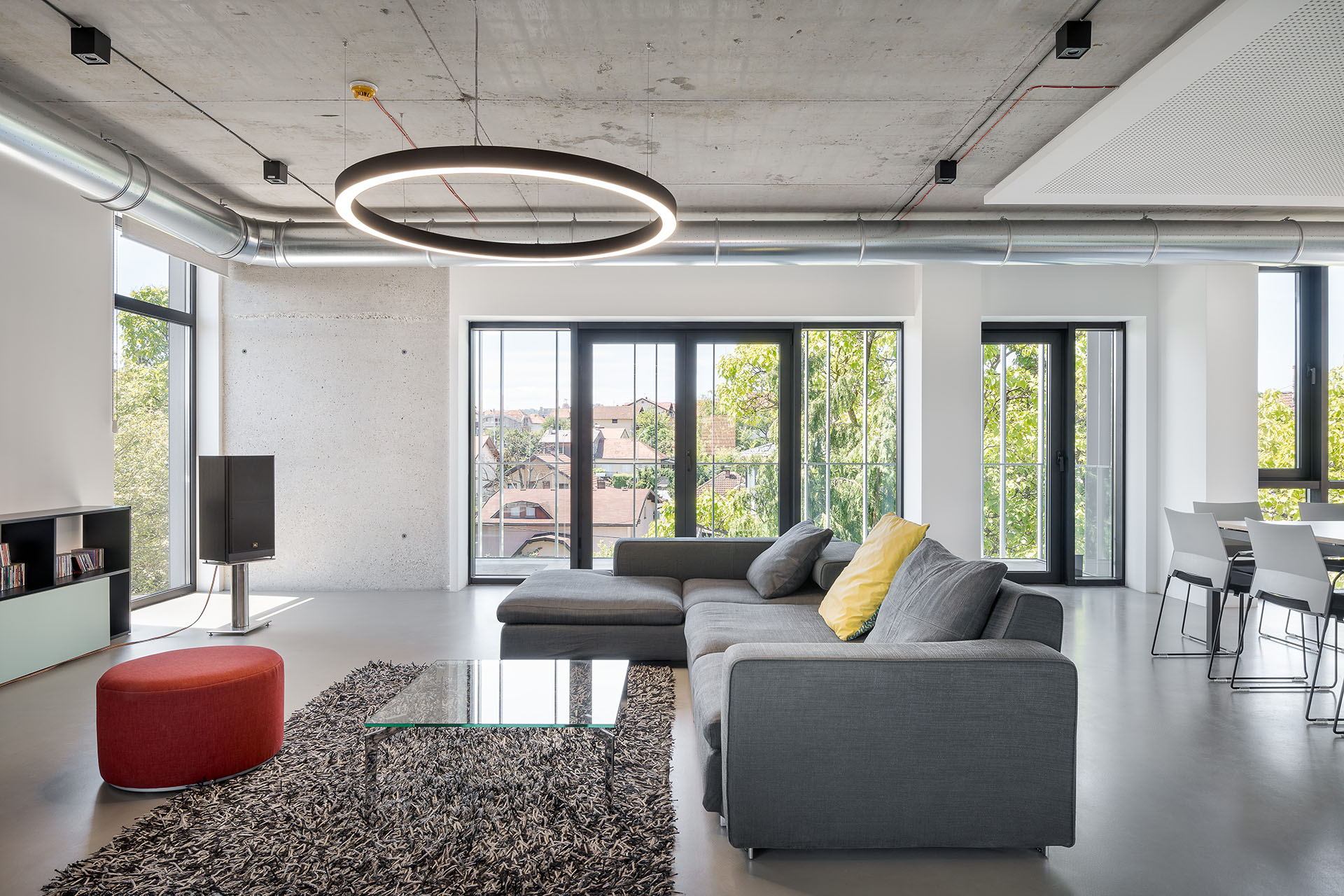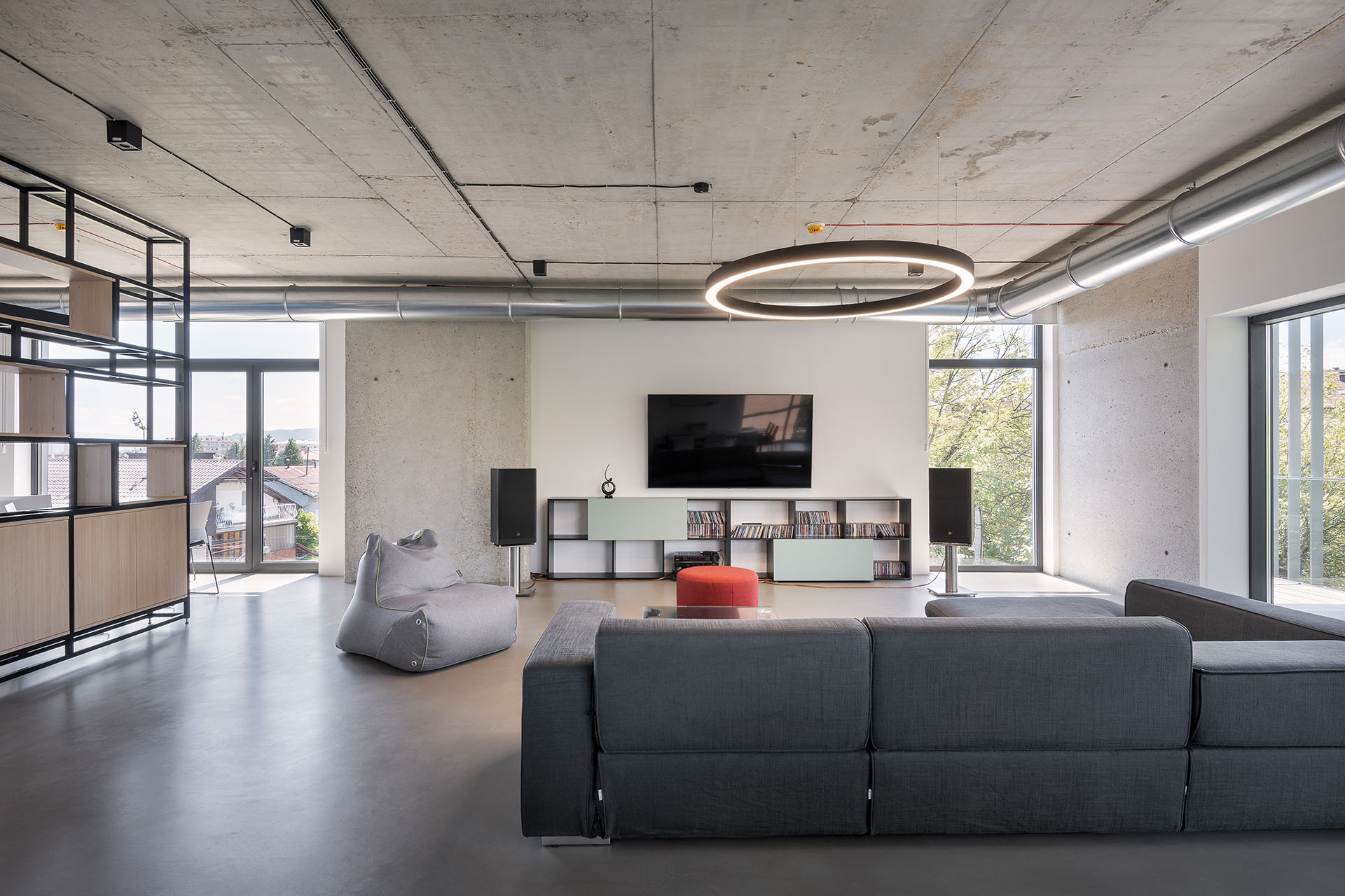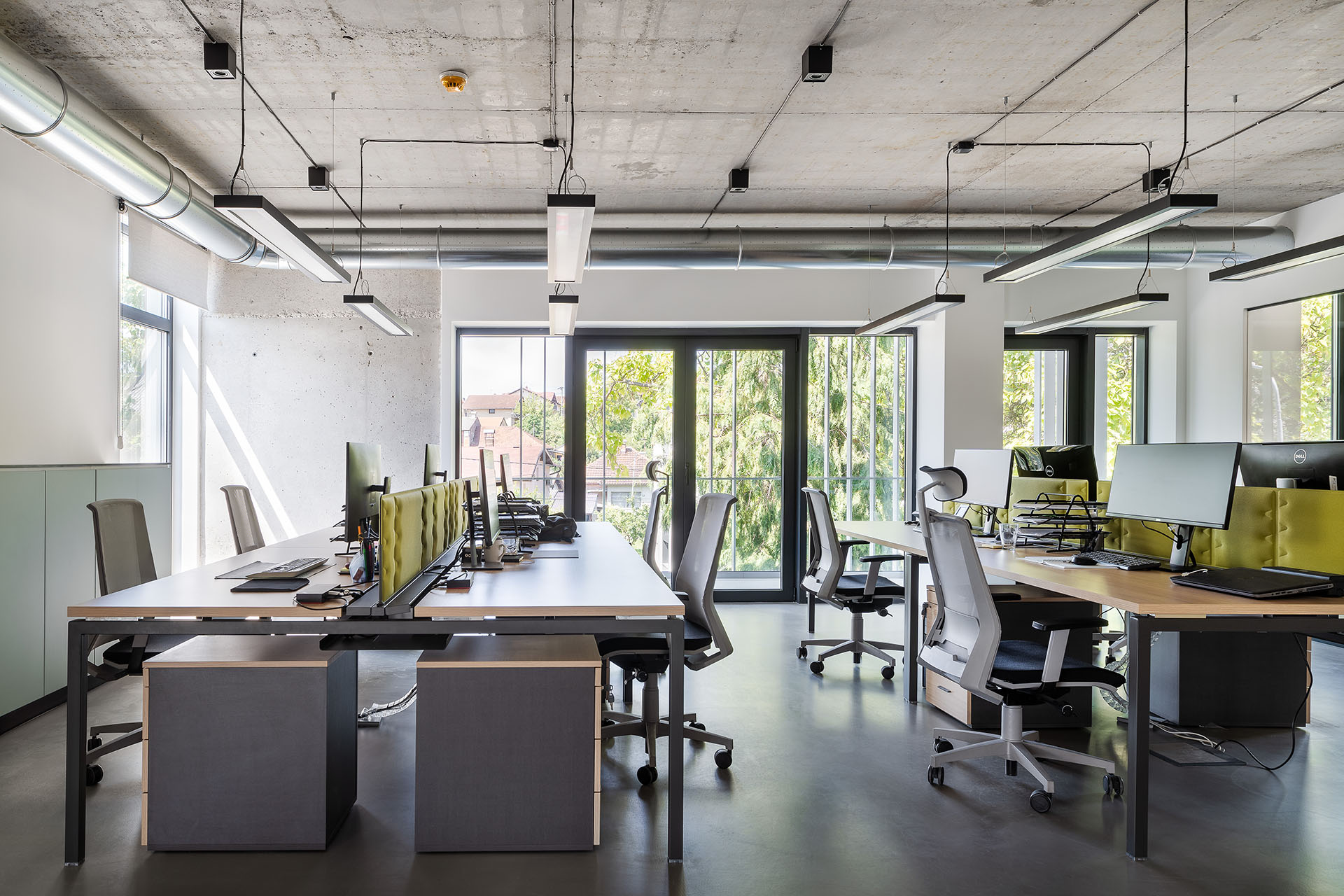 Pojedinačni spratovi organizovani su u otvorenom planu. Kancelarijski nameštaj je slobodno raspoređen, dok su pregrade od otvorenih polica. Plafoni i zidovi su totalno od natur betona, a podovi od mikrocementa – što može stvoriti probleme sa akustikom prostora.