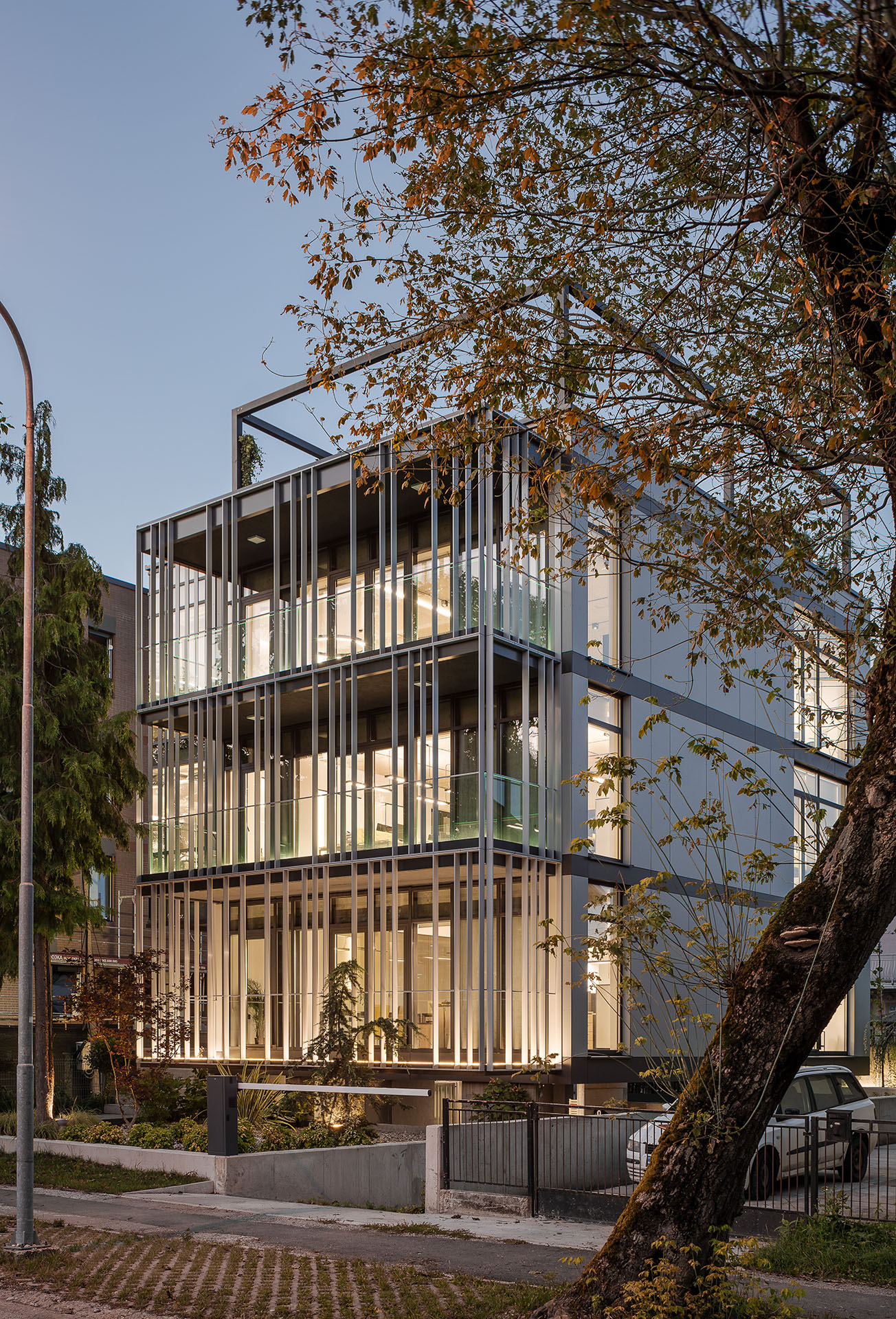 „Struktura objekta je svedena i čine je četiri etaže, od čega su tri u funkciji poslovanja, a jedna u funkciji parkiranja, i krovna terasa, međusobno povezane vertikalom na severo-istočnom delu objekta“ – navode arhitekte.