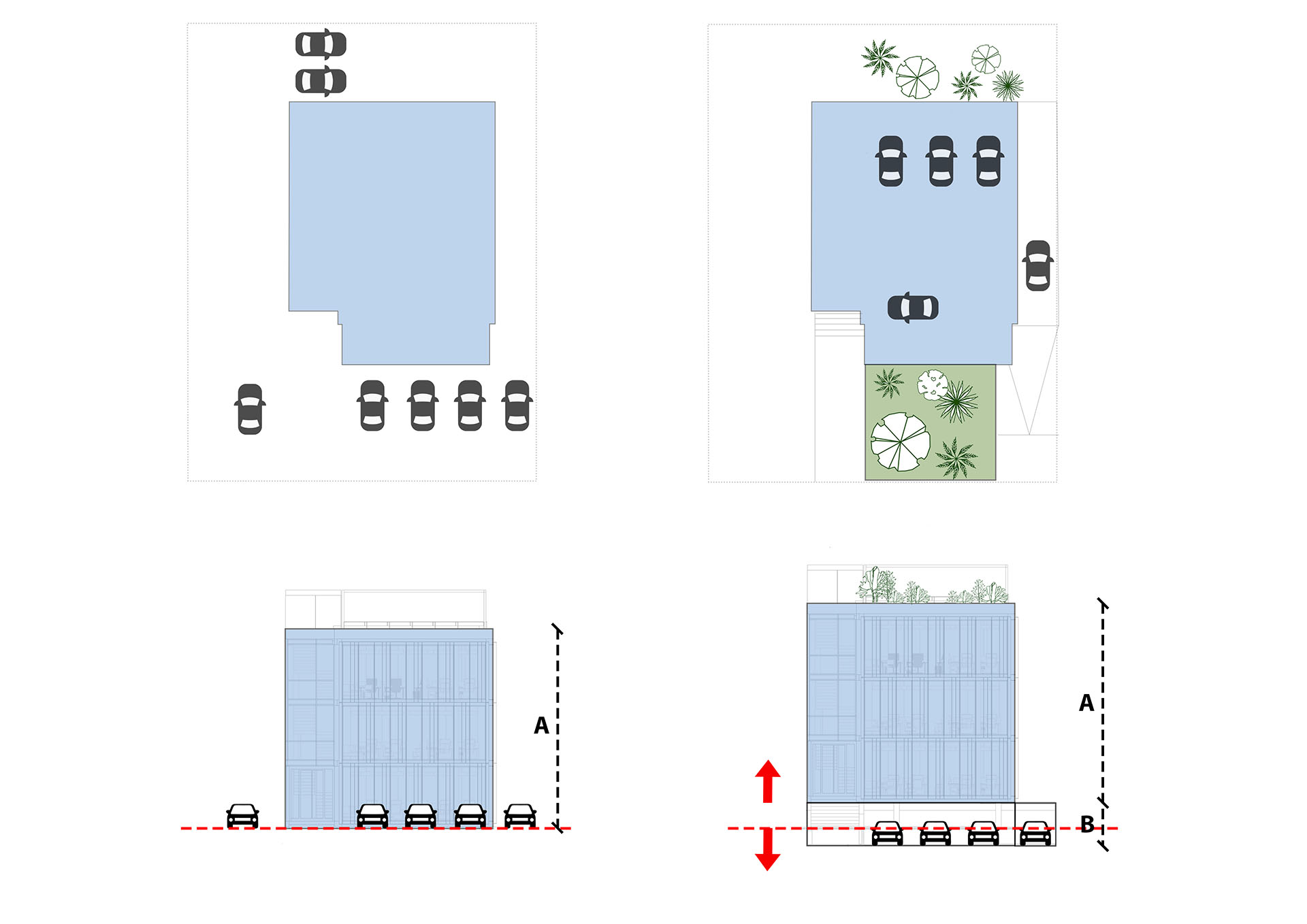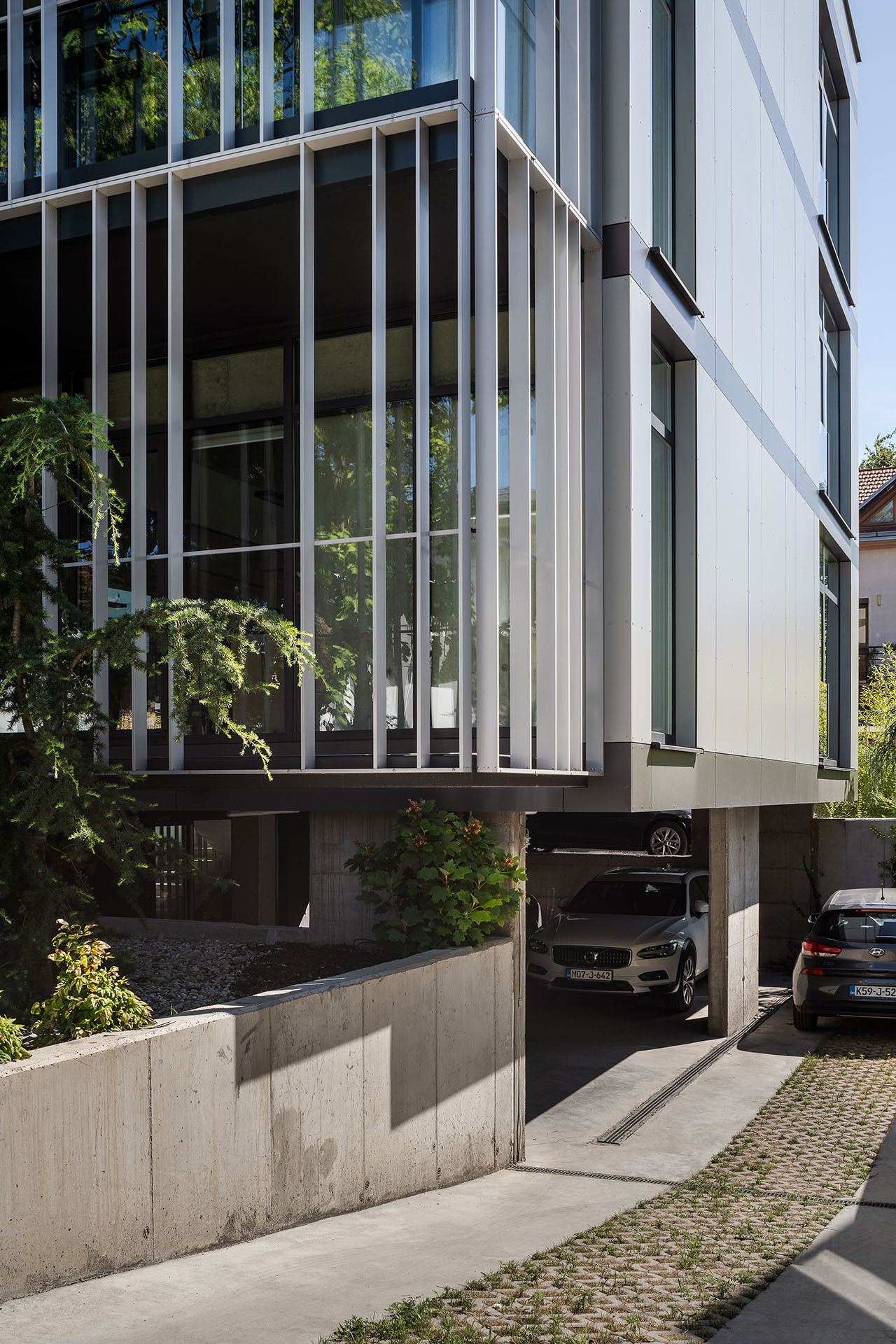Izdizanjem objekta u odnosu na teren arhitekte su uspele da parking smeste u suteren, iskoriste potencijale parcele i maksimalno zaštite postojeće zelenilo.