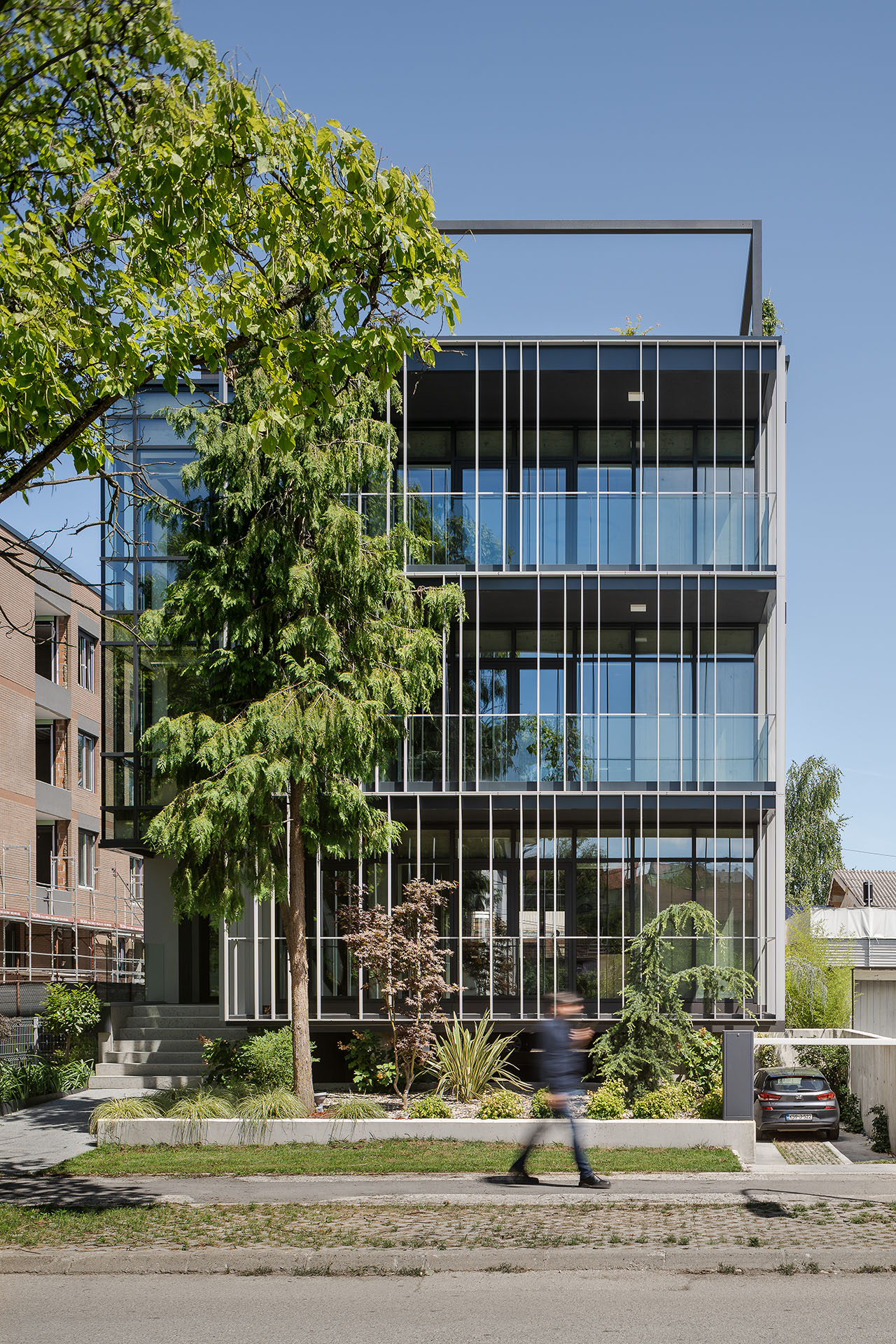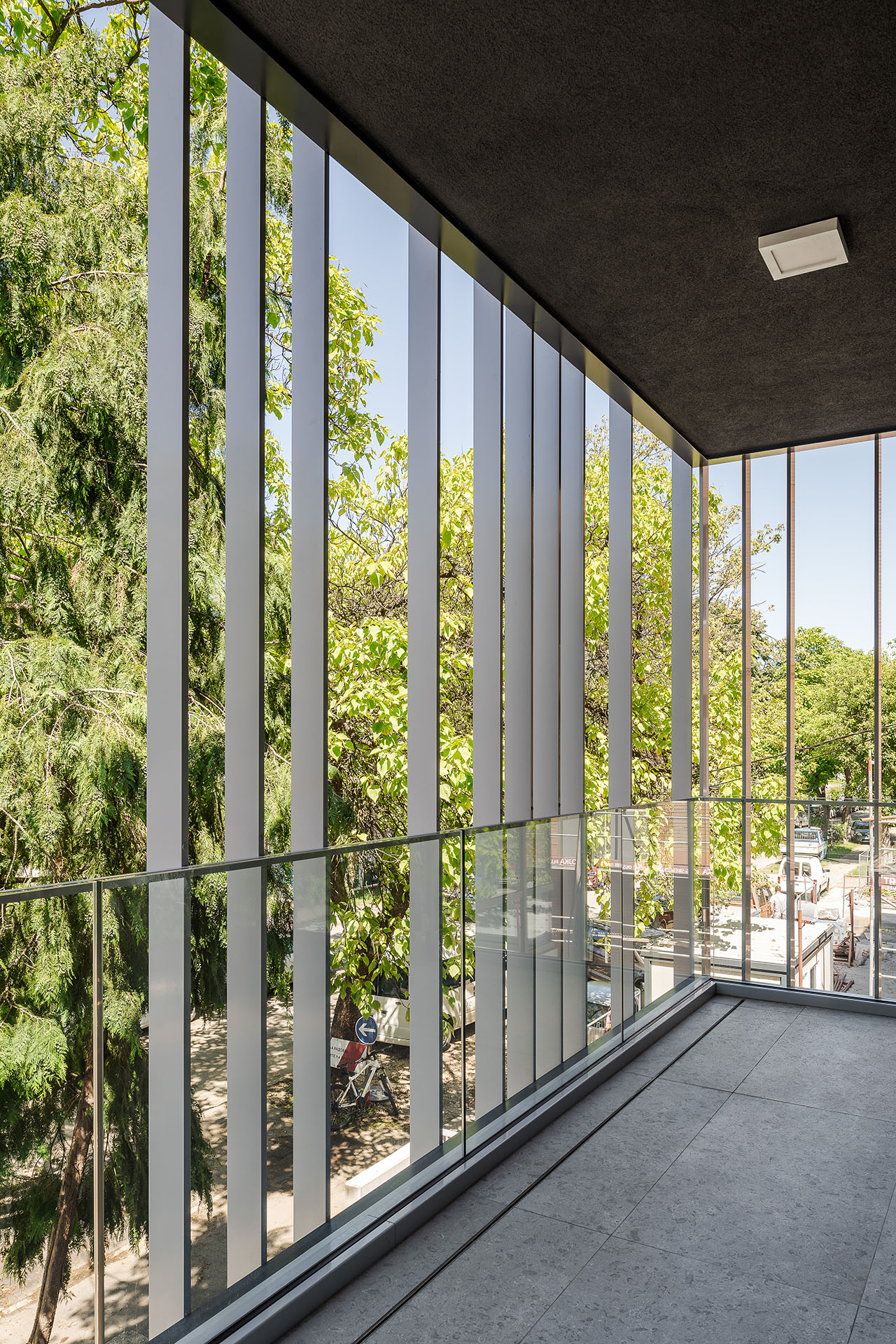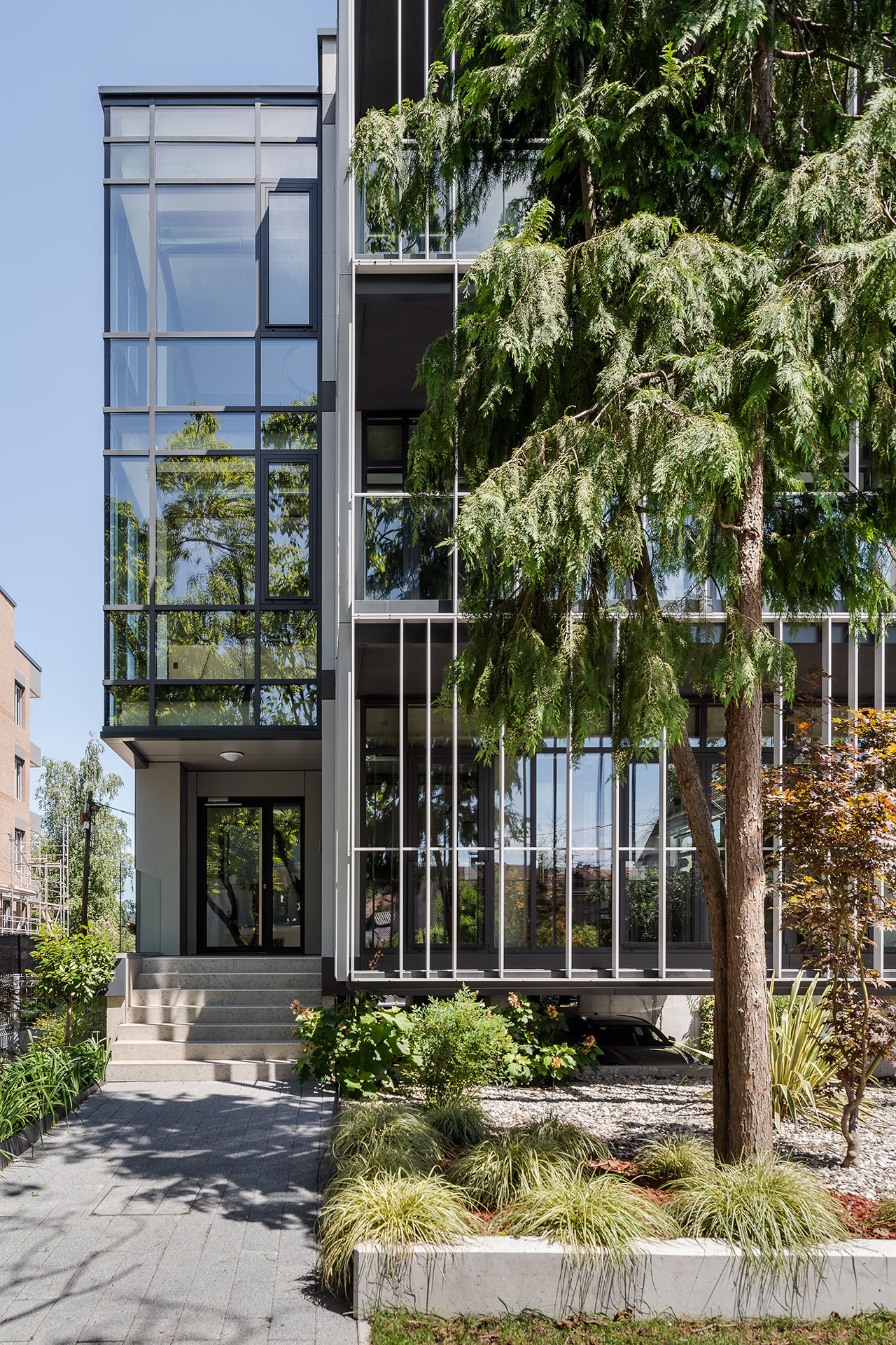 Bočne fasade, kao i ona okrenuta prema dvorištu, rađene su u kombinaciji fasadnih panela i staklenih stena koje se u nekim delovima pružaju skoro od poda do plafona.