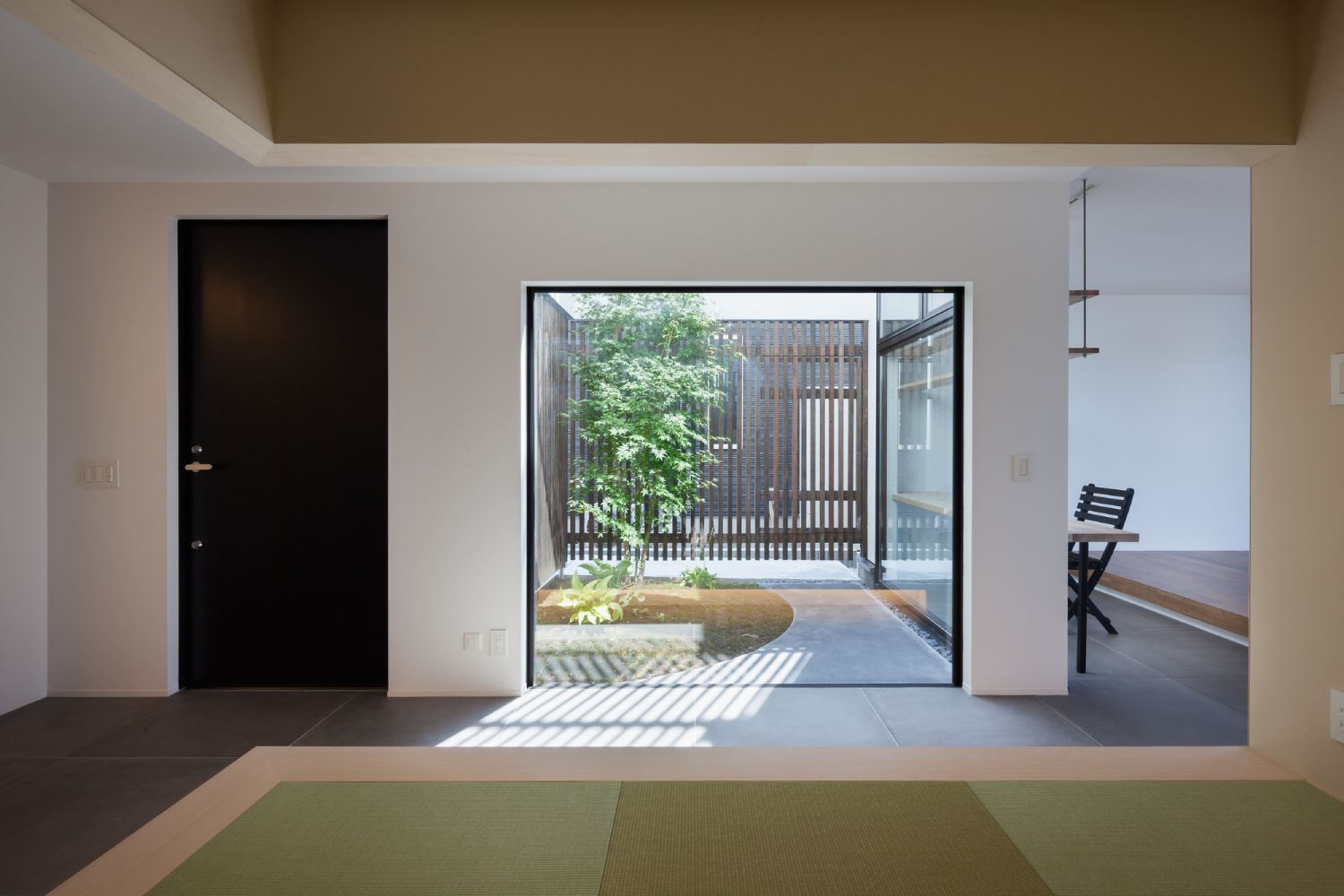 Ova dvospratna kuća je kao i u oblikovanju svoje forme tako i u organizaciji sadržaja na dva nivoa osmišljena na kontrastan način, piše Designboom. Tako je nivo prizemlja spokojan prostor na kom se nalazi pomenuto dvorište, glavna spavaća soba i tatami soba, odnosno prostor karakterističan za japansku kulturu koji obično služi za vežbanje borilačkih veština.