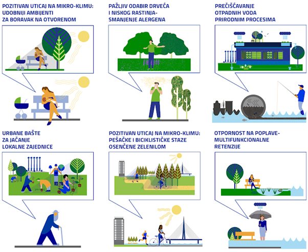 Prirodom inspirisana rešenja uvode elemente prirode u urbano okruženje (pametan izbor biljaka sa specifičnim funkcijama, biološko prečišćavanja voda, energiju zemlje, vetra i sunca itd.) kako bi se unapredio kvalitet života u tim sredinama i pozitivno uticalo na zdravlje i blagostanje građana: obezbedila prijatnija temperatura na mikrolokaciji, smanjilo zagađenje vazduha i količina alergena, biološki prečistila otpadna voda i iskoristila za navodnjavanje i ovlaživanje, itd.