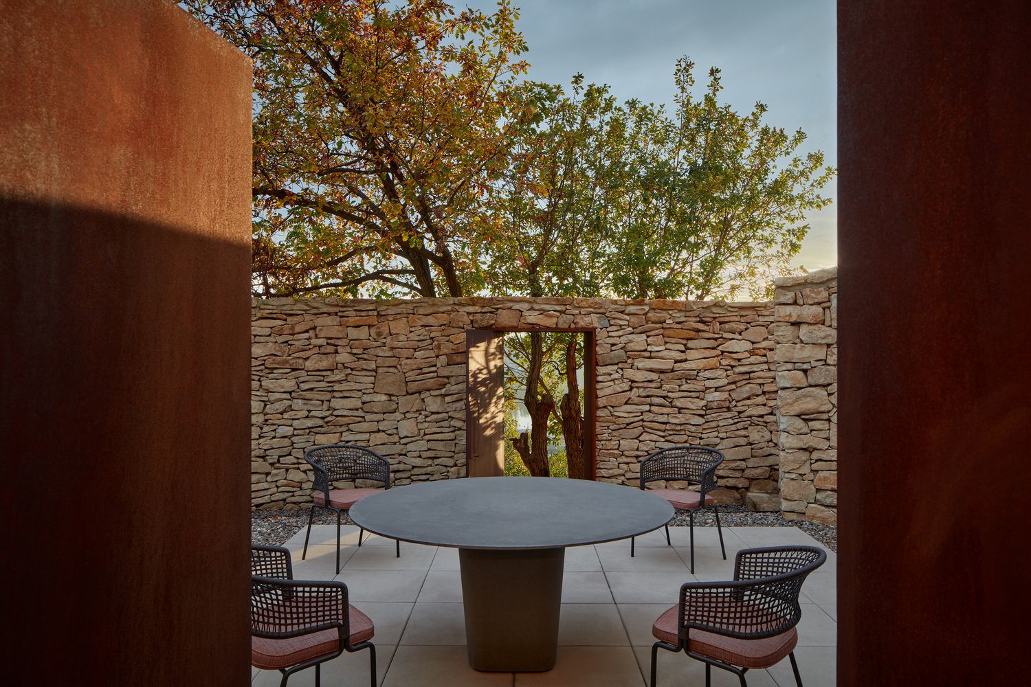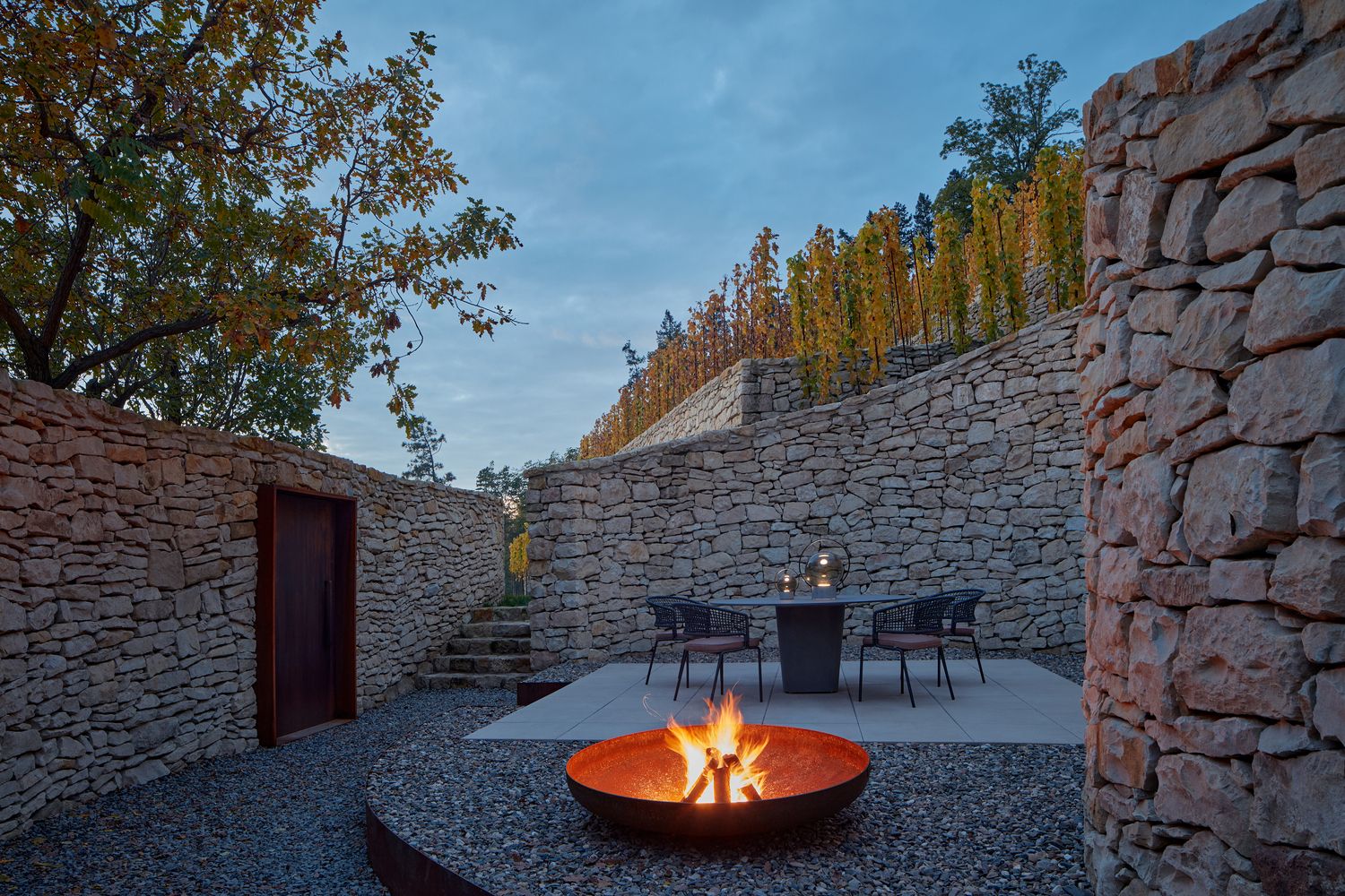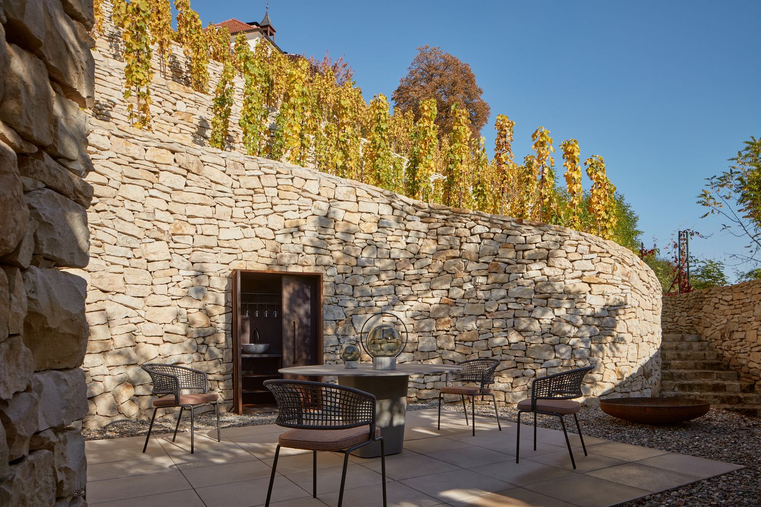 Jednostavan prostor, zatvoren u odnosu na grad, stvara ambijent koji usmerava fokus svojih korisnika nazad na dvorac i padinu sa nizovima vinove loze.