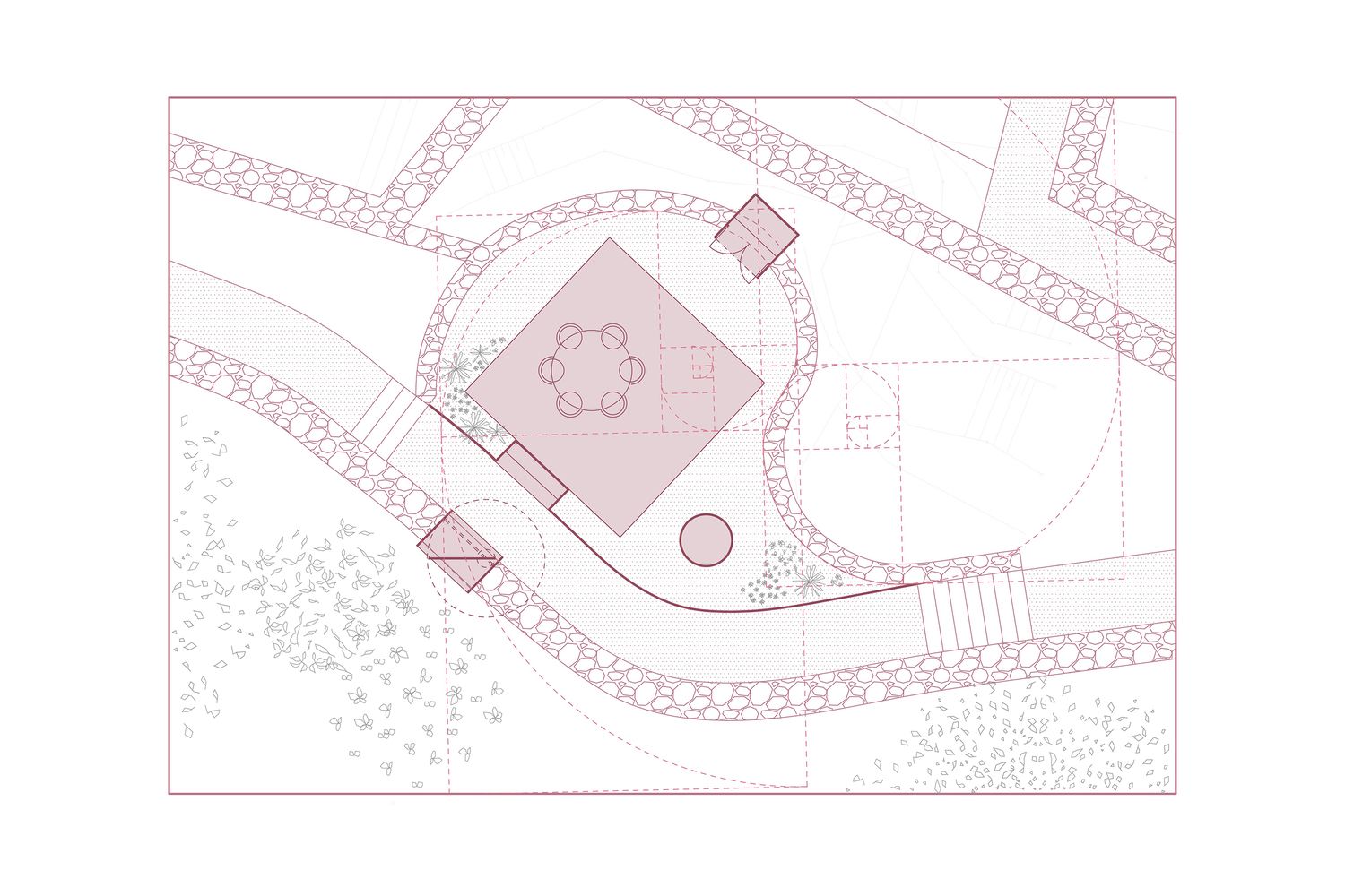 Celokupna intervencija je vođena otkrivanjem i očuvanjem postojećih elemenata pronađenih na licu mesta. Uokvirujući jedan od njih, stari hrast, i to sa masivnim vratima, uspostavljena je dominantna crta simbolike.