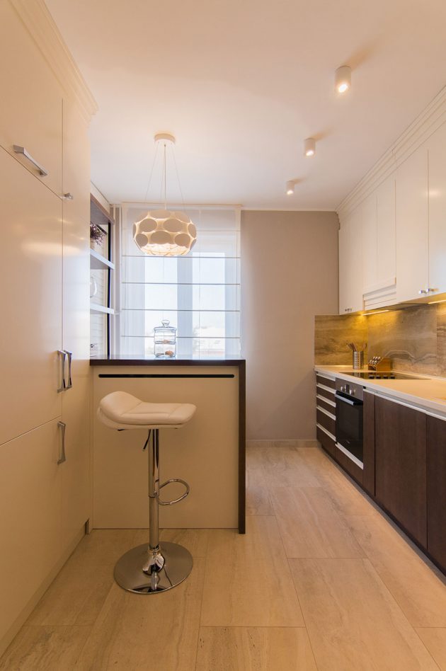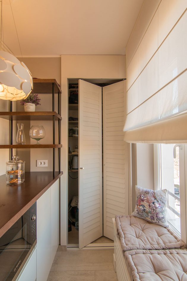 Iako zatečena kuhinja nije bila tako mala, njoj je pridružen deo koji je pre služio kao jedan od prolaza ka terasi. Vrata su zatvorena, a na tom mestu dobijena je zgodna ostava kojoj se pristupa preko zglobnih vrata.