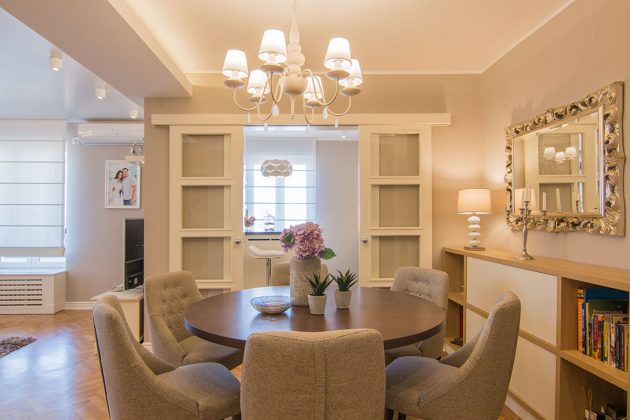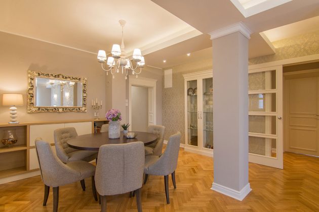 U trpezariju je postavljen veliki kružni sto u osi vrata kuhinje, a odmah naspram njega našla se staklena vitrina pravljena po meri i komodica ispod ogledala sa bogatim ramom.