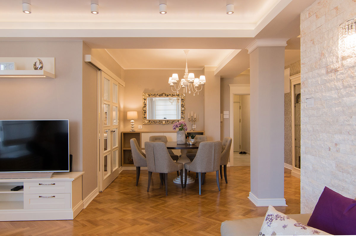 U trpezariju je postavljen veliki kružni sto u osi vrata kuhinje, a odmah naspram njega našla se staklena vitrina pravljena po meri i komodica ispod ogledala sa bogatim ramom.