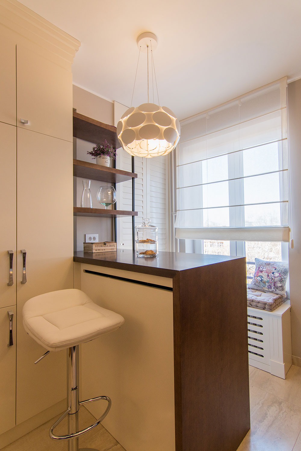 Iako zatečena kuhinja nije bila tako mala, njoj je pridružen deo koji je pre služio kao jedan od prolaza ka terasi. Vrata su zatvorena, a na tom mestu dobijena je zgodna ostava kojoj se pristupa preko zglobnih vrata.