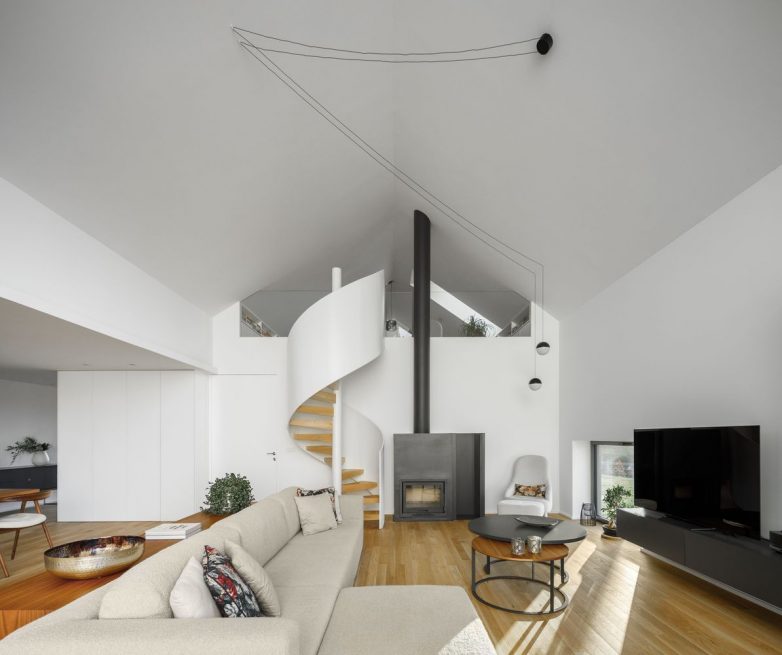 Na severoistoku, gde su smeštene tehničke prostorije kuća ima duplu spratnu visinu, pa se preko kružnog stepeništa iz prostora dnevnog boravka može stupiti na galeriju.