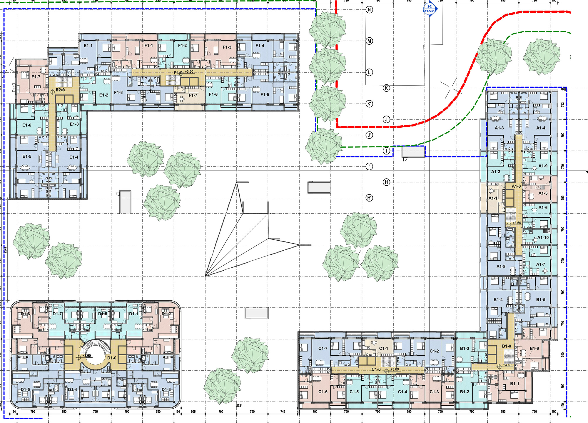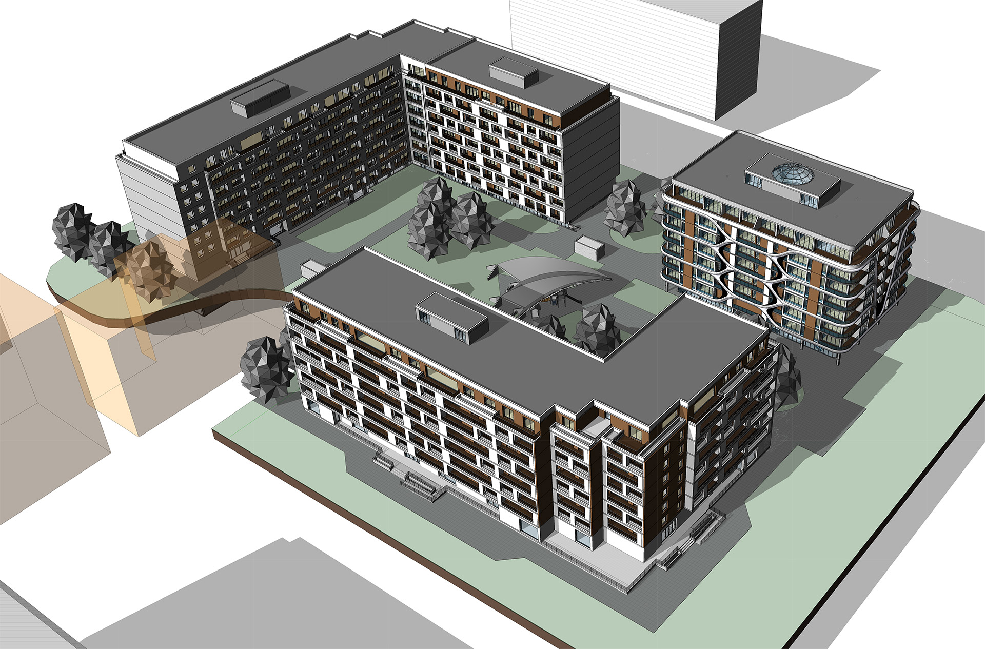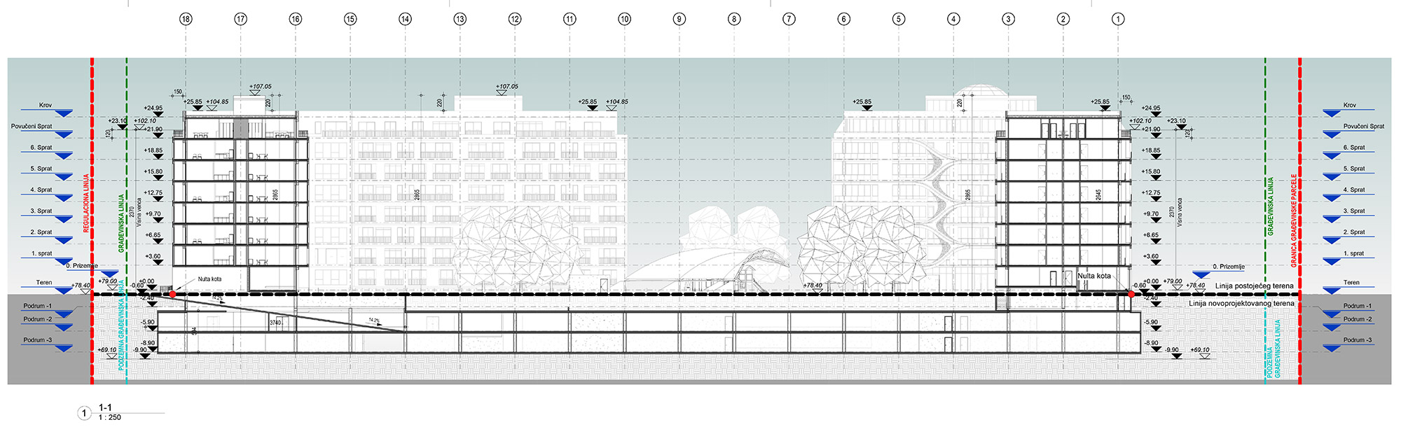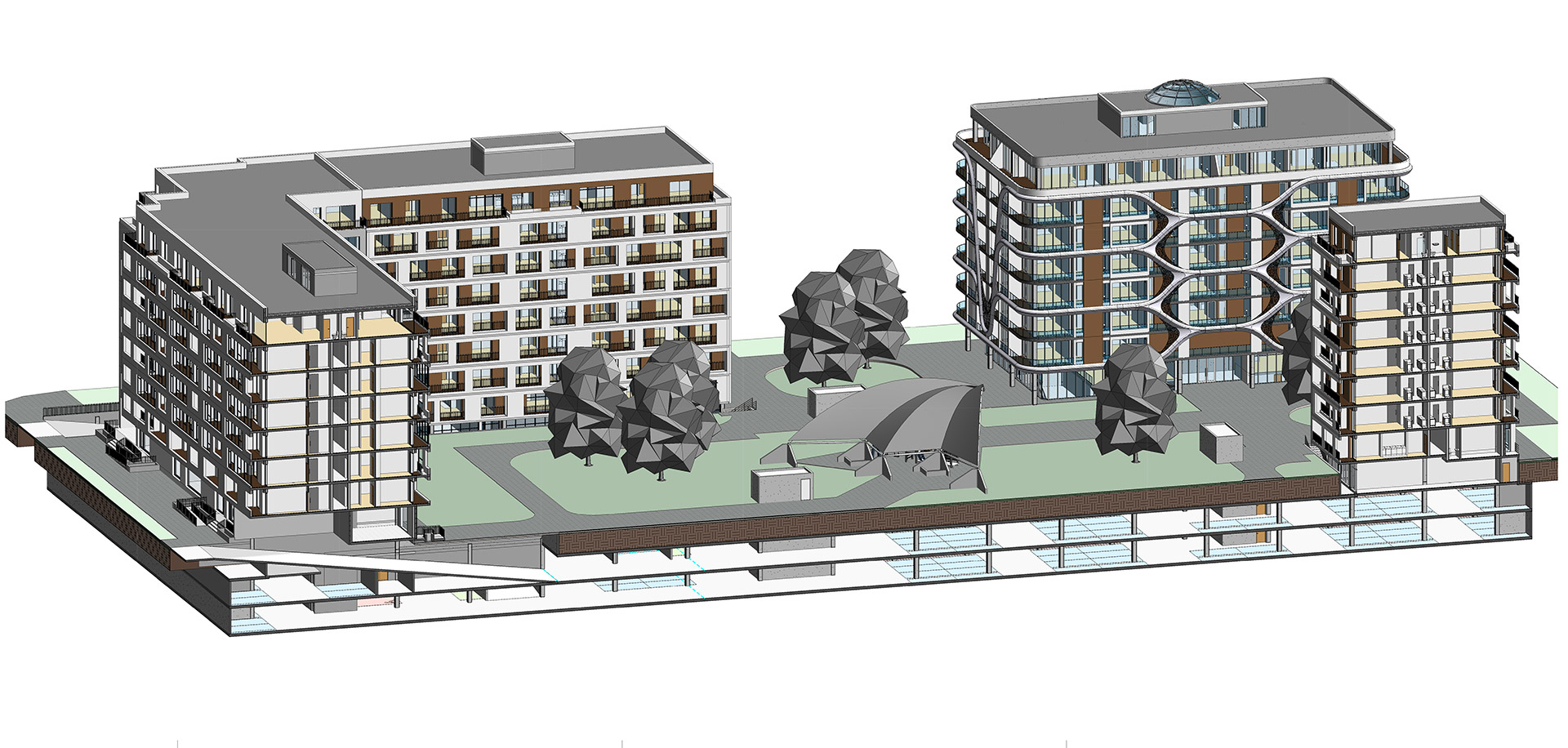 Po projektu arhitekte Dušana Bojkovića, na parceli je organizovana celina kao kompleks od četiri objekta sačinjena od šest vizuelno povezanih lamela spratnosti 3Po+P+6+Ps sa centralnim delom zelenih površina sa platoom.