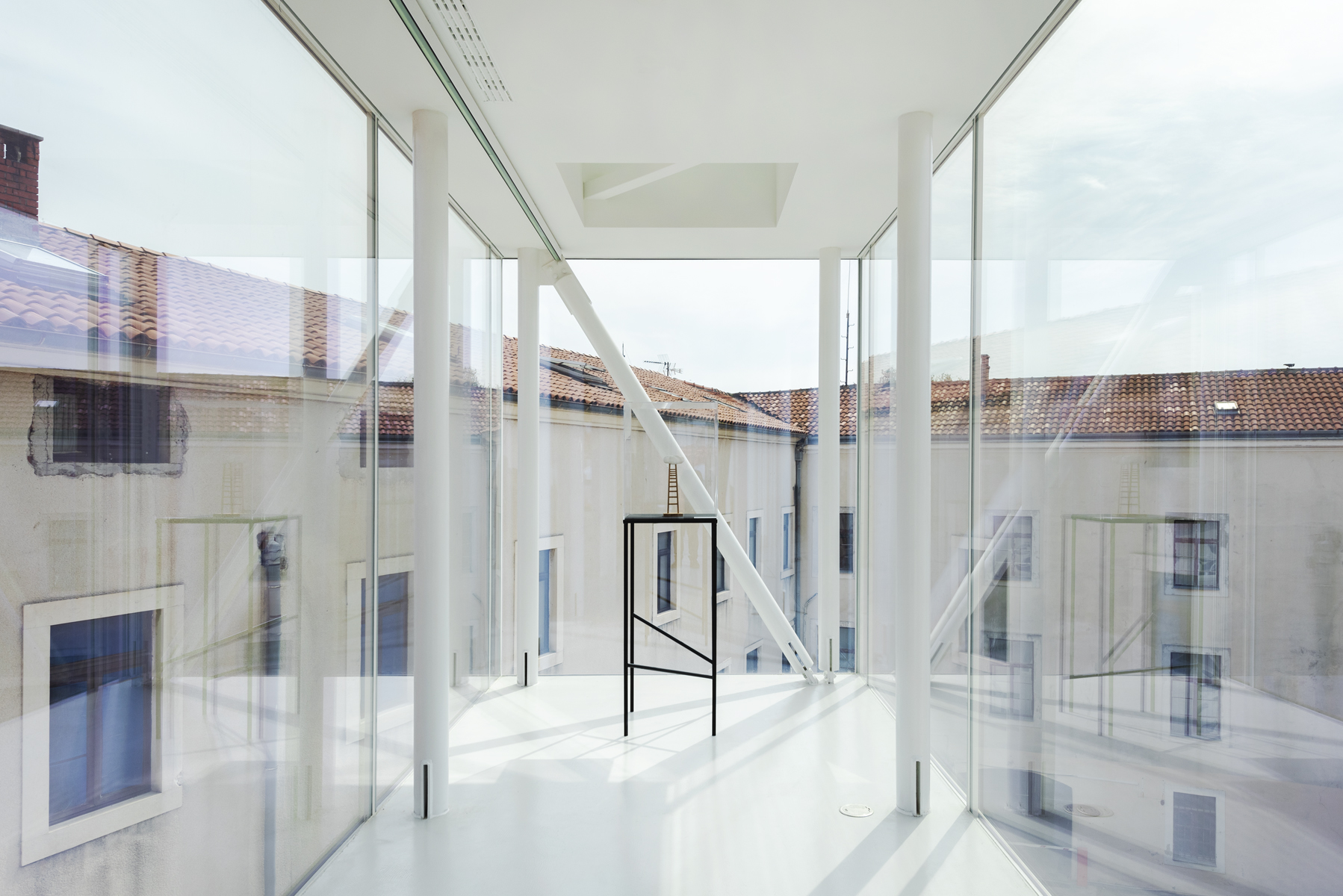 Ovaj neočekivani parazit prožima, integriše i oživljava istorijsku strukturu na koju se naslanja, skrivajući u svom konstruktivnom delu svu tehnološku opremu, a istovremeno ostavljajući netaknutu petu fasadu kuće.