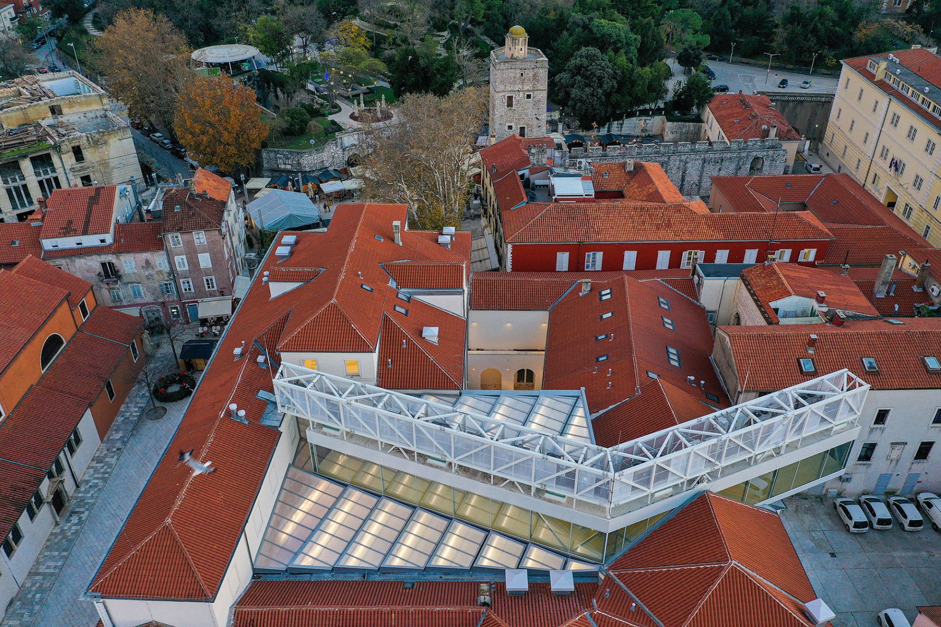 Iz naglašene i ugodno zaslepljujuće beline apstraktnog prostora atrijuma posetilac se uspinje do najviše etaže staklenog hodnika. Tu biva izbačen u plavetnilo neba, među crvene krovove okolne istorijske izgradnje Zadra.