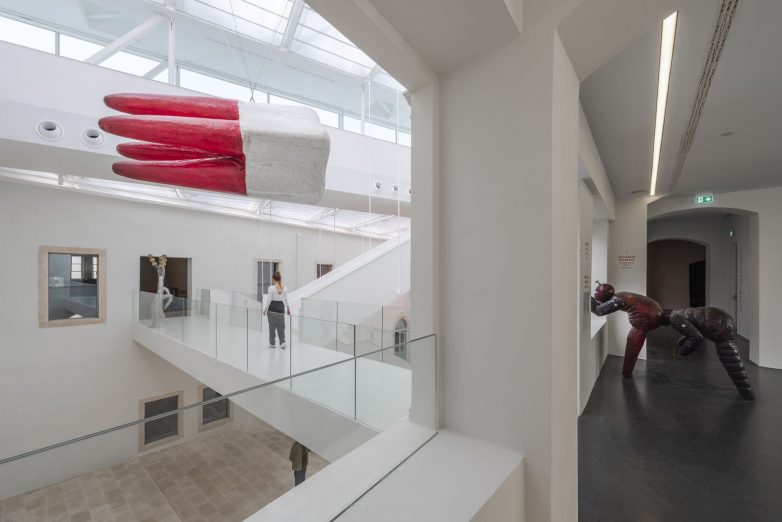 U prostoru atrijuma jasno je vidljiv susret starog i savremenog, preklapanjem istorijskih slojeva s novim arhitektonskim elementima.
