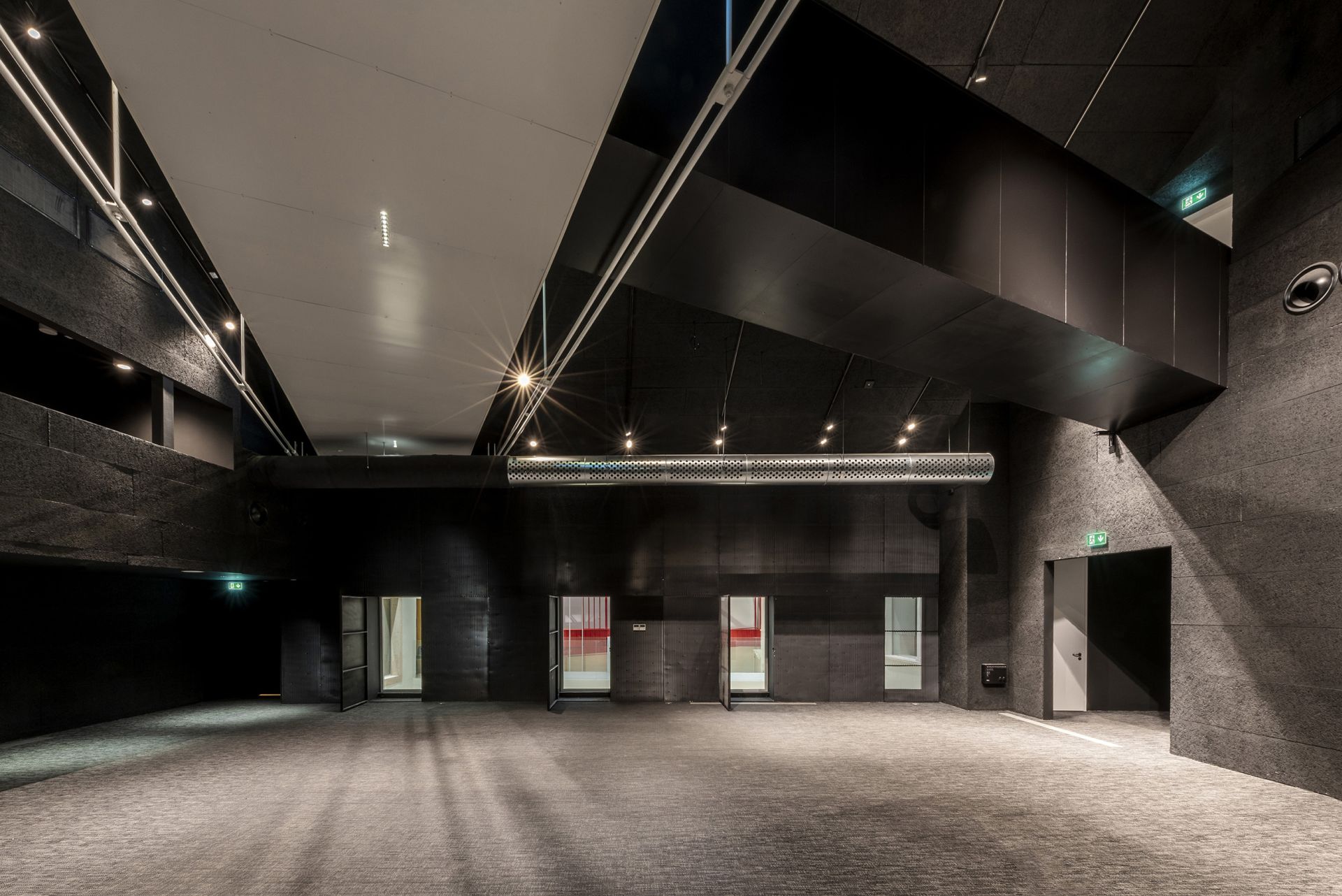 Prostrani višeetažni volumen atrijuma najmonumentalniji je deo kompleksa i preuzima važnu funkciju centralnog ulaza i izlaza, prostora iz kojeg se posetilac može uputiti u svako odeljenje Dvije palače, te se popeti od prizemne do poslednje etaže.