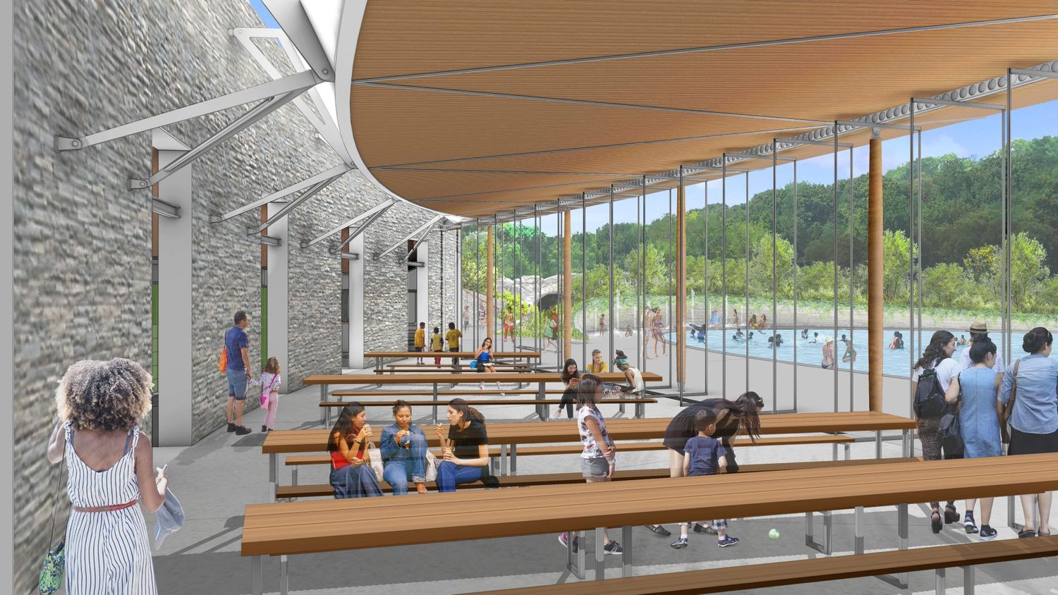 Stakleni zidovi, naglašeni vitkim drvenim stubovima, puštaće dnevnu svetlost unutar novog rekreaktivnog centra kako bi se što više smanjila potreba za dodatnom rasvetom, a ujedno će se uspostaviti vizuelan veza sa rekreativnim prostorima na otvorenom.