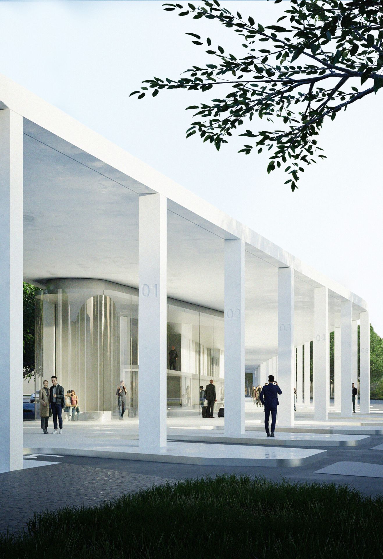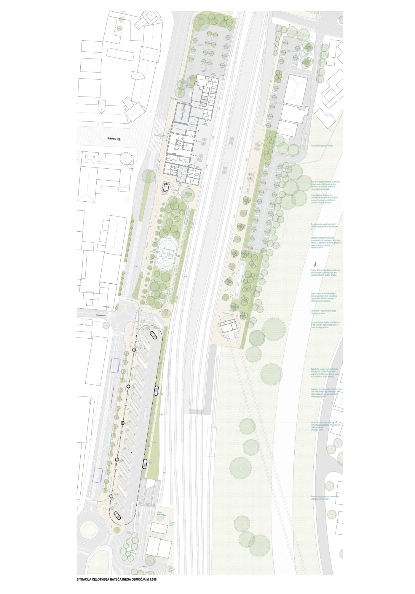 „Glavni, južni dvospratni paviljon kombinuje autobusku stanicu, nadzemni parking sprat i krovni park sa komplementarnim pratećim programom. Ključni povezujući element je novi gradski park, smešten između autobuske i železničke stanice. Transparentni paviljon koji stoji u njegovom centru deluje kao spoj različitih funkcija i programa“.