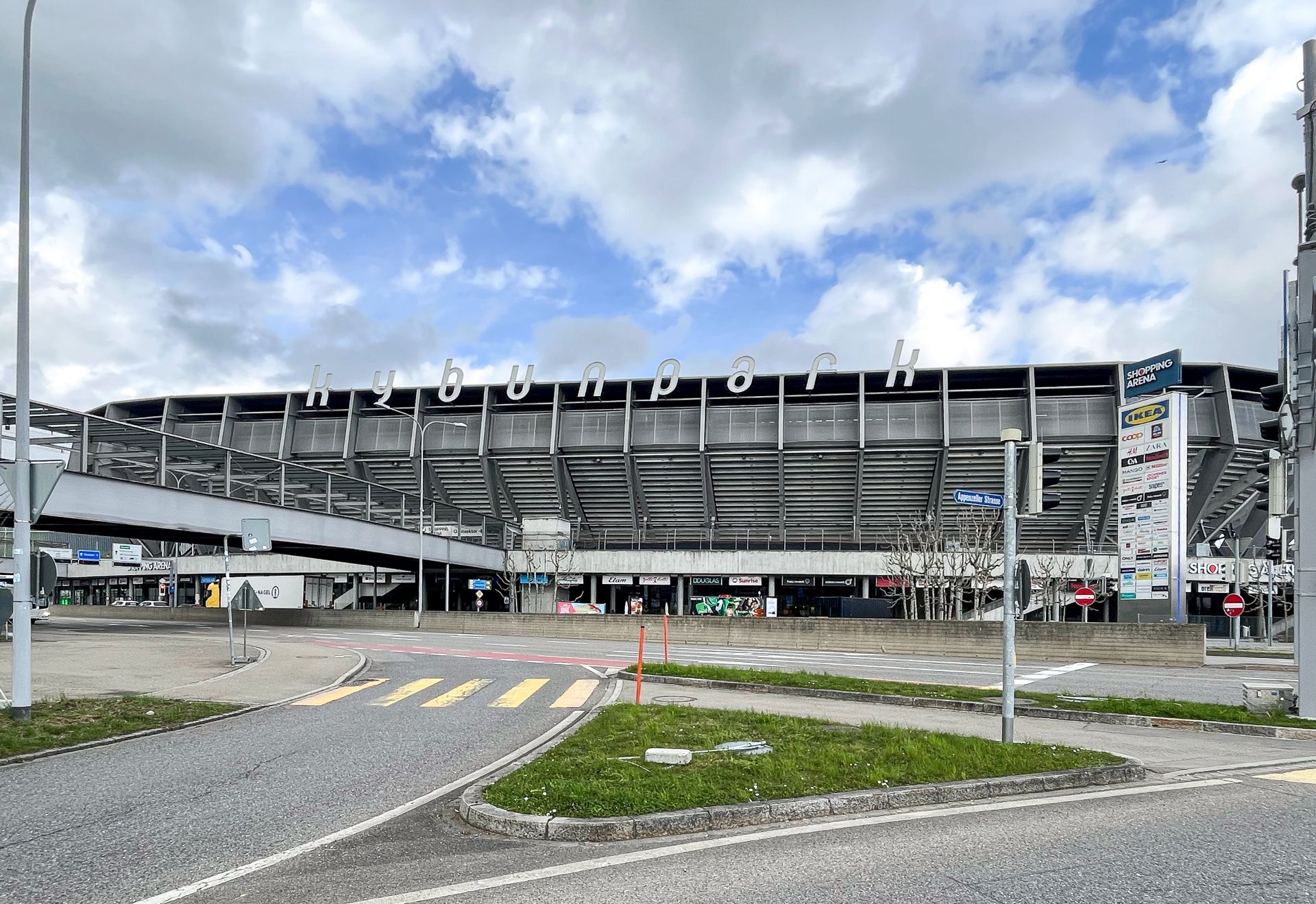 Stadion je, naime, deo većeg kompleksa komercijalnog tržnog centra te sama zanimljivost proizilazi iz prepoznate vrednosti malog švajcarskog grada da ovakav vid velike javne investicije se može jedino isplatiti kroz jednu „mix-use“ tipologiju. Specifičnost ovog stadiona je u betonskim kaskadnim tribinama koje oblikuju i samu formu i fasadu objekta kao ovog malog gradskog repera.