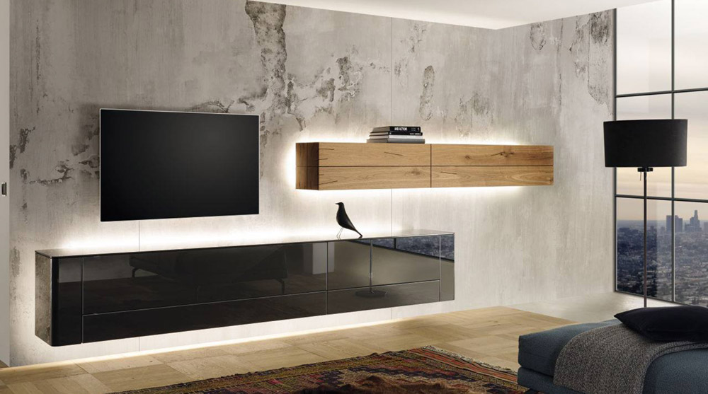 U kolekciji nameštaja za dnevnu sobu mogu se videti TV police u kombinaciji visokog sjaja i rustik teksture drveta. Ove kontrastne materijalizacije trenutno su vrlo aktuelne u dizajnu enterijera.