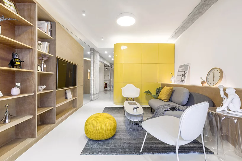 Kako piše Design Boom, arhitekte su u ovome uspele zahvaljujući inovativno dizajniranim „kutijama“ nepravilnih oblika u kojima su smeštene dve najvažnije zone jednog stana – njegova kuhinja i spavaća soba. Tako su se svi kuhinjski elementi i aparati našli u žutoj „kutiji“ obloženoj PVC-om, toalet je skriven u drvenoj kutiji pored, a u posebnoj drvenoj jedinici nalazi se zona za spavanje.