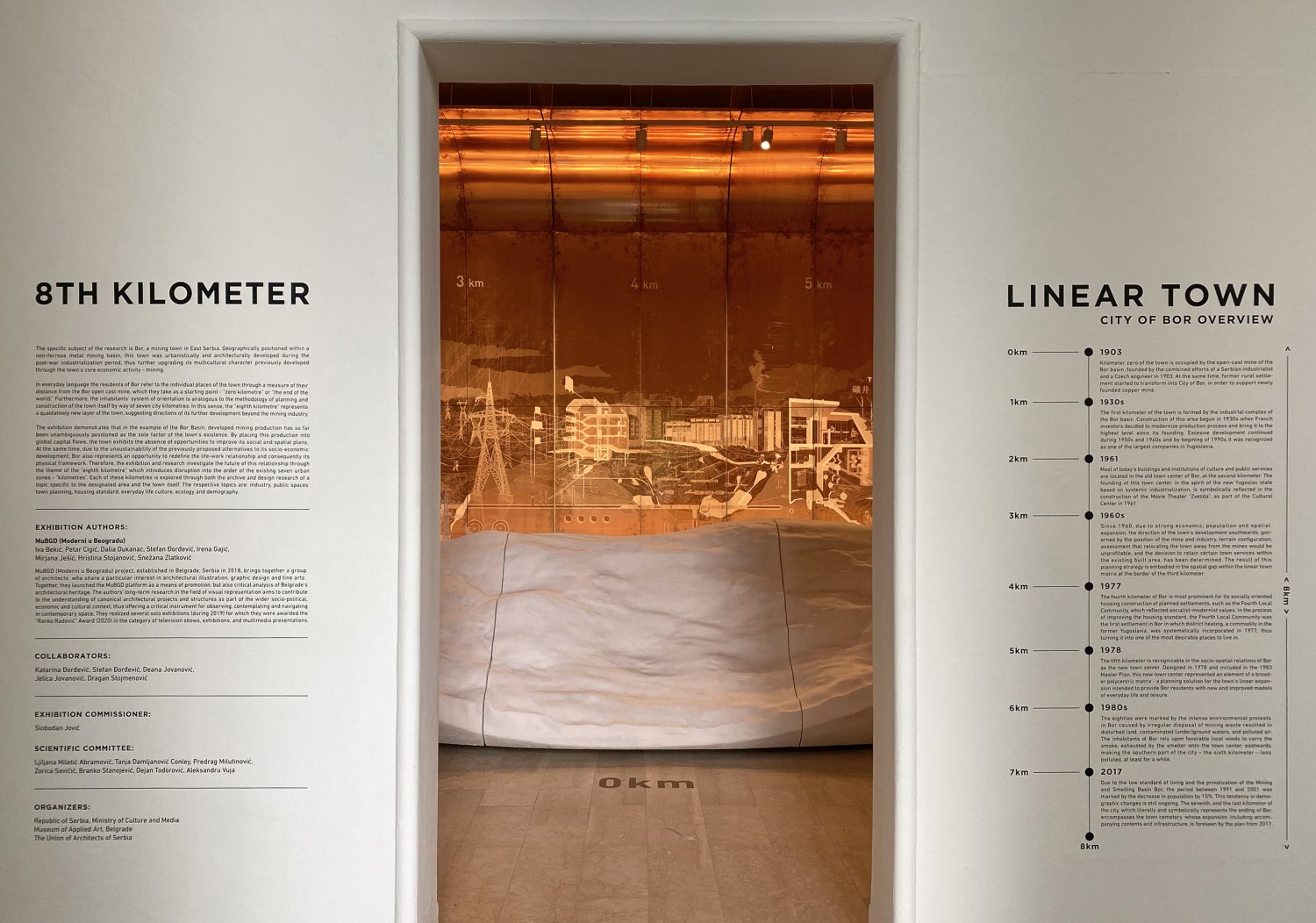 Izložba prikazuje kako se na primeru Borskog basena razvijena rudarska proizvodnja do sada jednoznačno postavljala kao isključivi faktor postojanja grada. Umrežavanjem ove proizvodnje u globalne tokove kapitala, u gradu se ispoljava odsustvo mogućnosti rada na društvenom i prostornom planu. Ujedno, usled neodrživosti predloženih alternativa socio-ekonomskog razvoja Bora, to je i prilika za redefinisanje odnosa život – rad, a time i fizičkog okvira unutar kog se navedeni procesi odvijaju. Stoga izložba i istraživanje razmatraju budućnost ovog odnosa kroz temu „osmog kilometra”, koji uvodi poremećaj u poredak postojećih sedam gradskih zona.