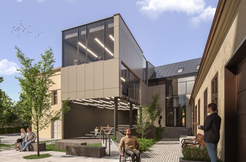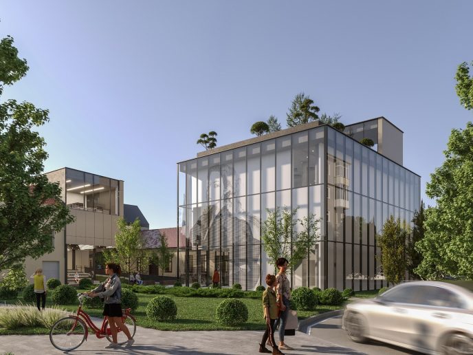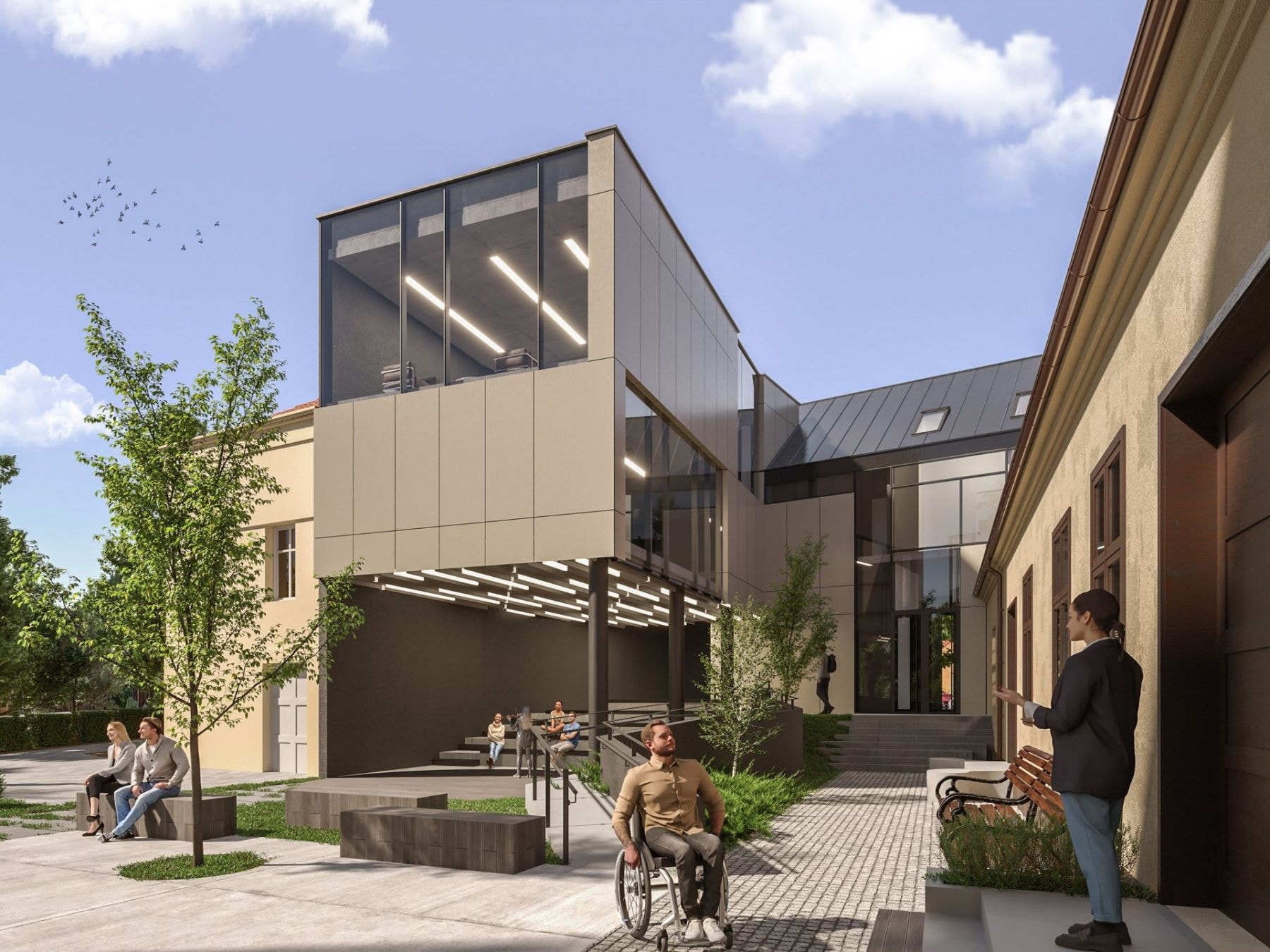 Kao što se može videti iz priloženih rendera, najupadljiviji element projekta je novi aneks, projektovan kao transparentni kubus u dvorišnom delu kompleksa. U potpunom kontrastu sa tradicionalnim volumenom kuće, nova dogradnja koristi staklenu fasadu velikog rastera, čime se postiže vizuelna otvorenost prema javnom prostoru.