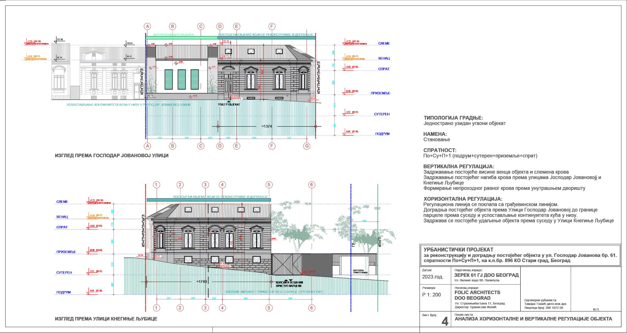 Volumen dograđenog dela objekta izgrađen je do visine uličnog gabarita objekta i u skladu je sa zadatom horizontalnom i vertikalnom regulacijom kao i funkcionalnim zahtevima.