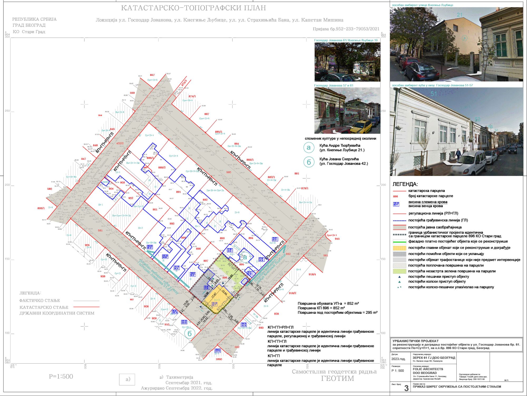 Predmetna parcela je ugaona, zauzima površinu od 852 m² i nalazi se na uglu ulica Gospodar Jovanove i Kneginje Ljubice.